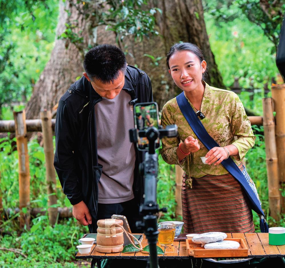 在云南景迈山大平掌古茶林,傣族姑娘仙金(右)在 直播售卖普洱茶(2023 年 9 月 17 日摄) 胡超摄 / 本刊