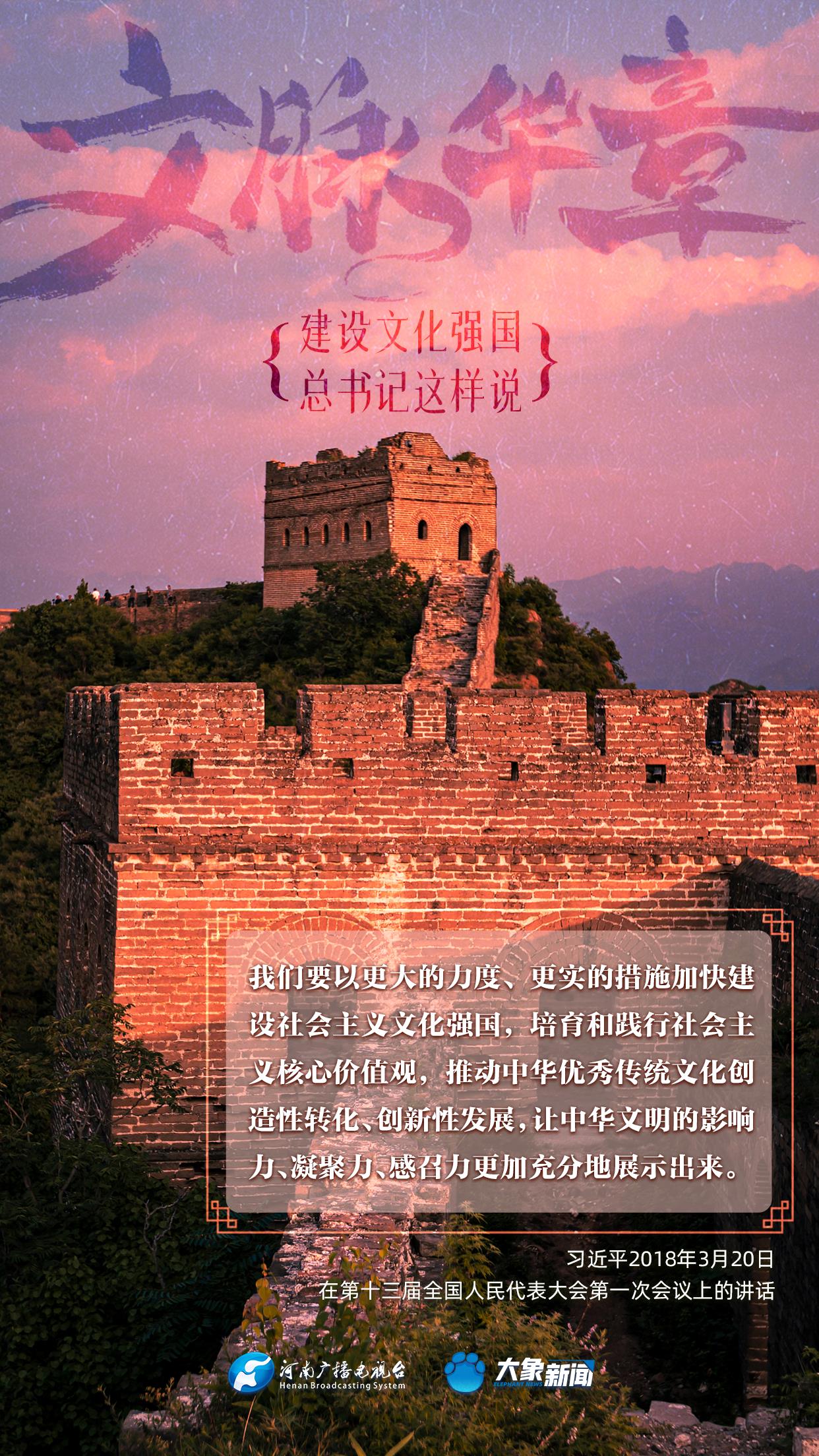 党的十八大以来,习近平总书记站在全局和战略高度,就建设社会主义文化强国提出一系列新思想新观点新论断,为我们坚定文化自信,坚持中国特色社会主义文化发展道路,提供了指引。大象新闻与您一起学习、领悟。