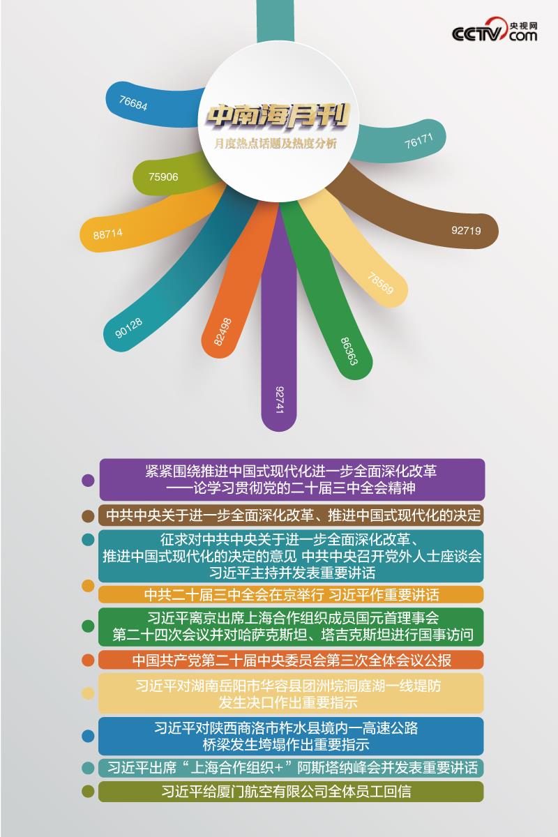 央视网“智闻”系统提取分析2024年7月全网时政新闻热点显示,本月“中共中央关于进一步全面深化改革、推进中国式现代化的决定”“中共二十届三中全会在京举行 习近平作重要讲话”等话题备受关注。