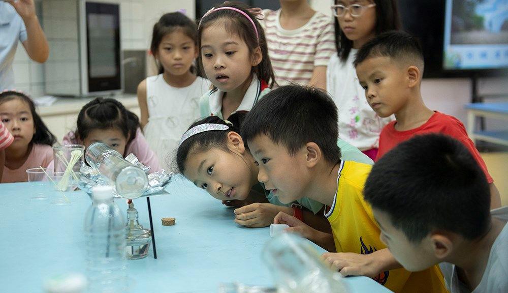 △安徽科技馆,小朋友观察海水淡化科学实验。