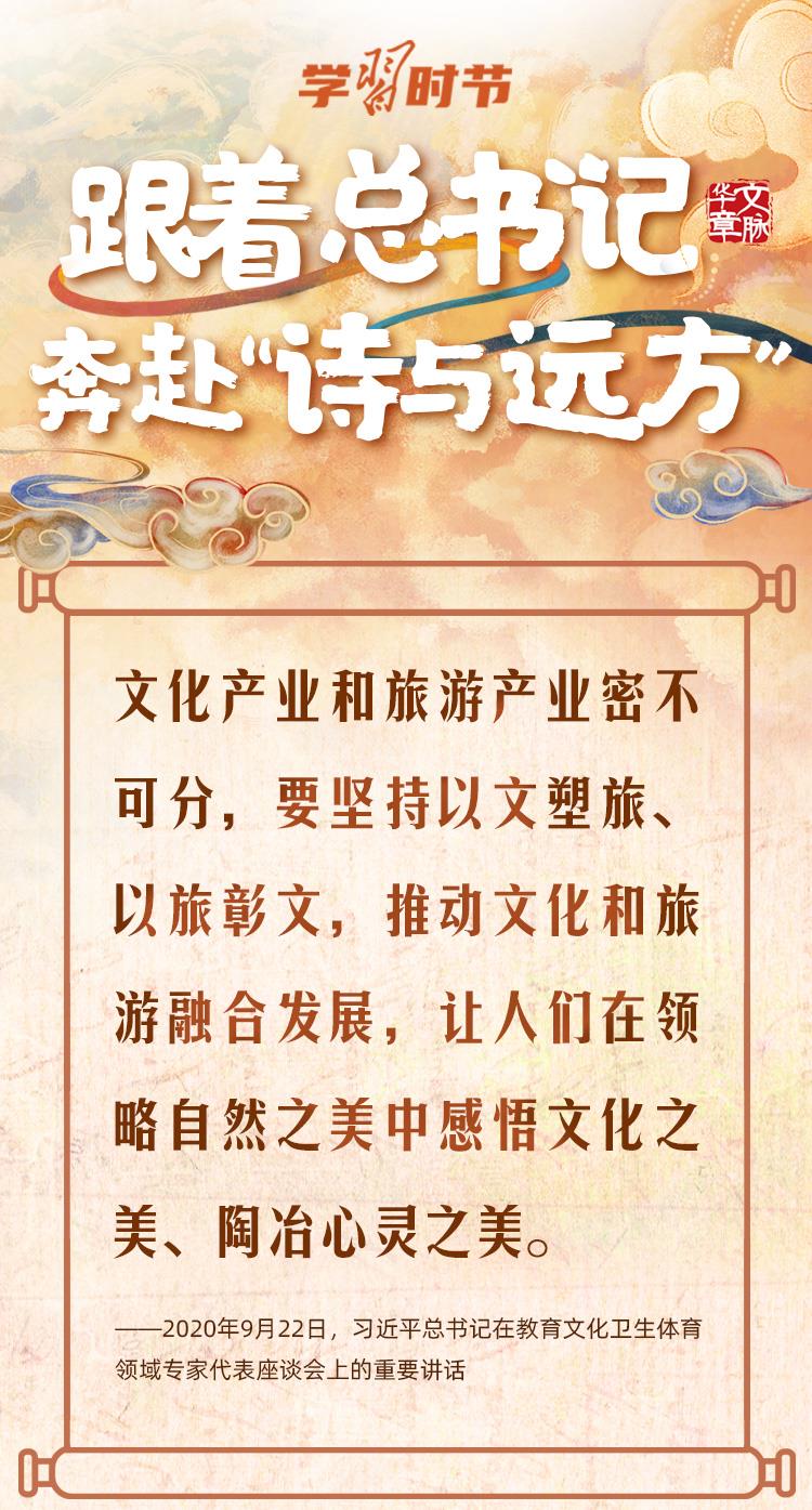 文化产业和旅游产业密不可分。正值暑假,文旅市场持续升温,“文博游”蔚然成风,国潮国风已成为年轻人新时尚。让我们跟随总书记的脚步,坚持以文塑旅、以旅彰文,走独具特色的中国旅游发展之路,一同奔赴“诗与远方”。