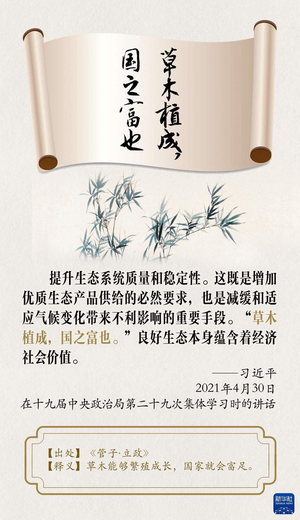 中华民族向来尊重自然、热爱自然,绵延5000多年的中华文明孕育着丰富的生态文化。习近平总书记曾多次引用古语典故阐述生态文明,让我们一起品读,领悟其中的深刻警示和启迪。