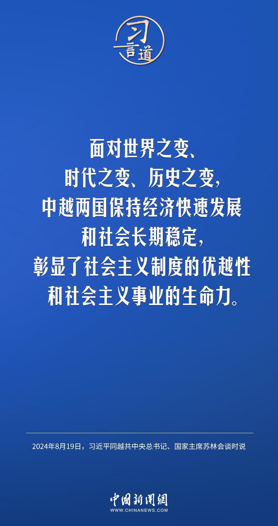 8月19日,中共中央总书记、国家主席习近平在北京人民大会堂同来华进行国事访问的越共中央总书记、国家主席苏林举行会谈。习近平指出——
