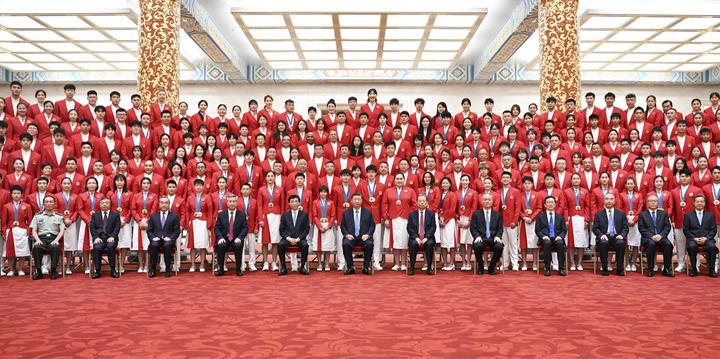 8月20日,党和国家领导人习近平、赵乐际、王沪宁、蔡奇、李希、韩正等在人民大会堂接见第33届夏季奥林匹克运动会中国体育代表团全体成员。新华社记者 鞠鹏 摄