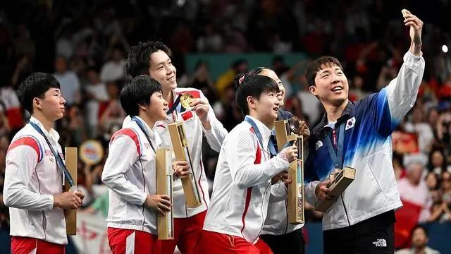 在乒乓球混合双打的颁奖现场,中朝韩三国年轻选手们合影留念,这超越体育、跨越国界的一幕获得众多观众点赞。