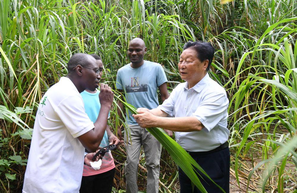 2021年8月12日,福建农林大学国家菌草工程技术研究中心首席科学家林占熺(右一)在福建农林大学菌草园让尼日利亚留学生试尝幼嫩菌草的味道。新华社记者 林善传 摄