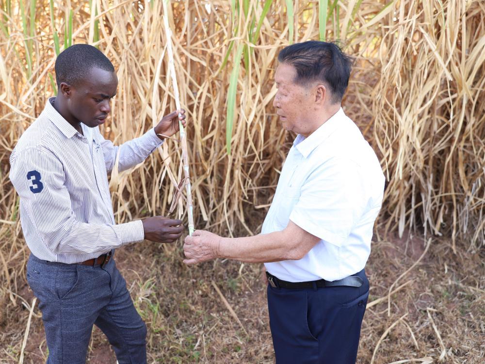 8月4日,在卢旺达南方省,林占熺为当地菌草种植户奥贝德答疑解惑。新华社发(黄万晴摄)