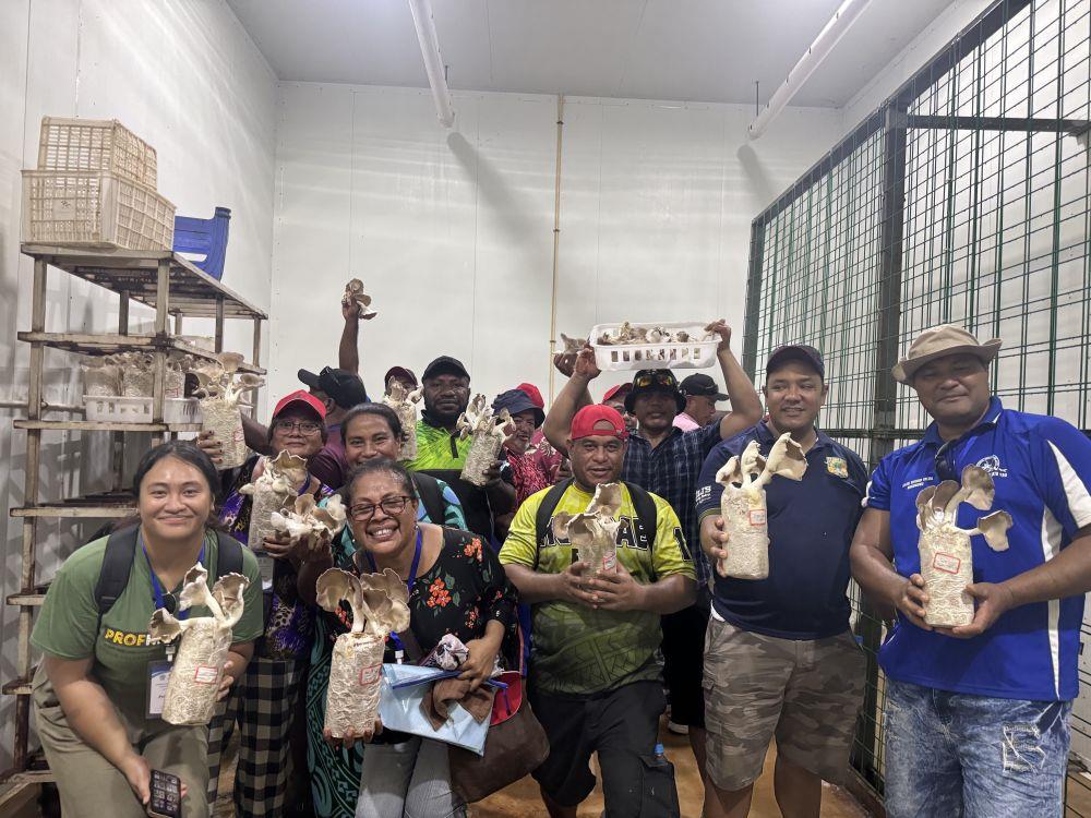 2月28日,在斐济楠迪,培训班学员手捧菌草菇合影。新华社发(中国援斐济菌草技术示范中心供图)