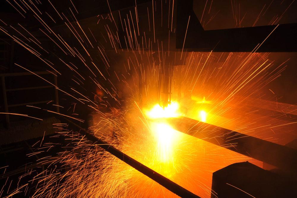 2015年3月10日,东北特钢集团大连基地生产的合金钢连铸坯进行定尺切割。新华社发