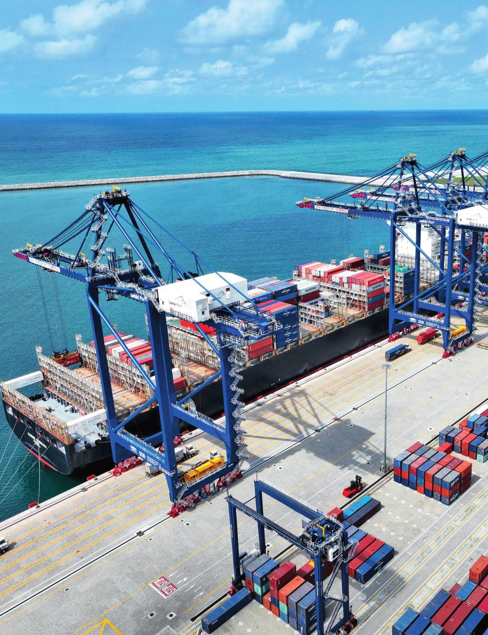 由中国港湾工程有限责任公司承建的尼日利亚莱基深水港位于中尼合作建设的拉各斯莱基自贸区内,是尼日利亚首个现代化深水港和最大港口。图为一艘货轮在尼日利亚拉各斯莱基深水港装卸集装箱(2024 年 3 月 11 日摄)莱基港公司供图