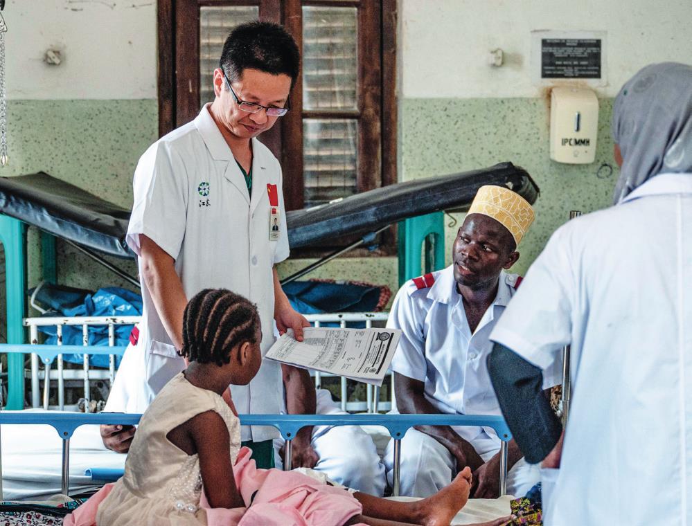 中国援桑给巴尔医疗队队长蒋国庆(左)在坦桑尼亚桑给巴尔的纳兹莫加医院查房(2023 年 12 月 29 日摄)王冠森摄 / 本刊
