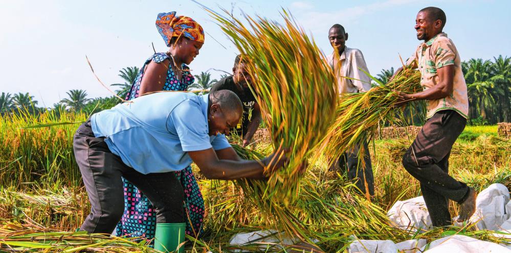 2018 年,中国农业专家组在布隆迪布班扎省吉汉加县设立首个水稻减贫示范村。图为当地农户在稻田里给杂交水稻脱粒(2023 年 6 月 20 日摄) 韩旭摄 / 本刊