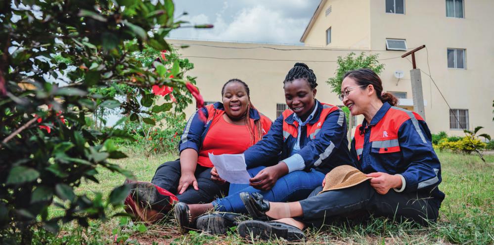 在肯尼亚内罗毕,非洲之星铁路运营公司工电部电子设备检修工区工长陈玲(右)在休息时教学员唱中文歌曲(2023 年 5 月 23 日摄) 王冠森摄 / 本刊