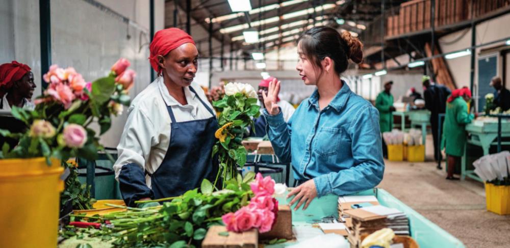 湖南玺悦国际贸易有限公司负责人黄梓楠(右)在肯尼亚纳纽基的坦布济花卉农场挑选鲜花(2024 年 5 月 18 日摄)王冠森摄 / 本刊
