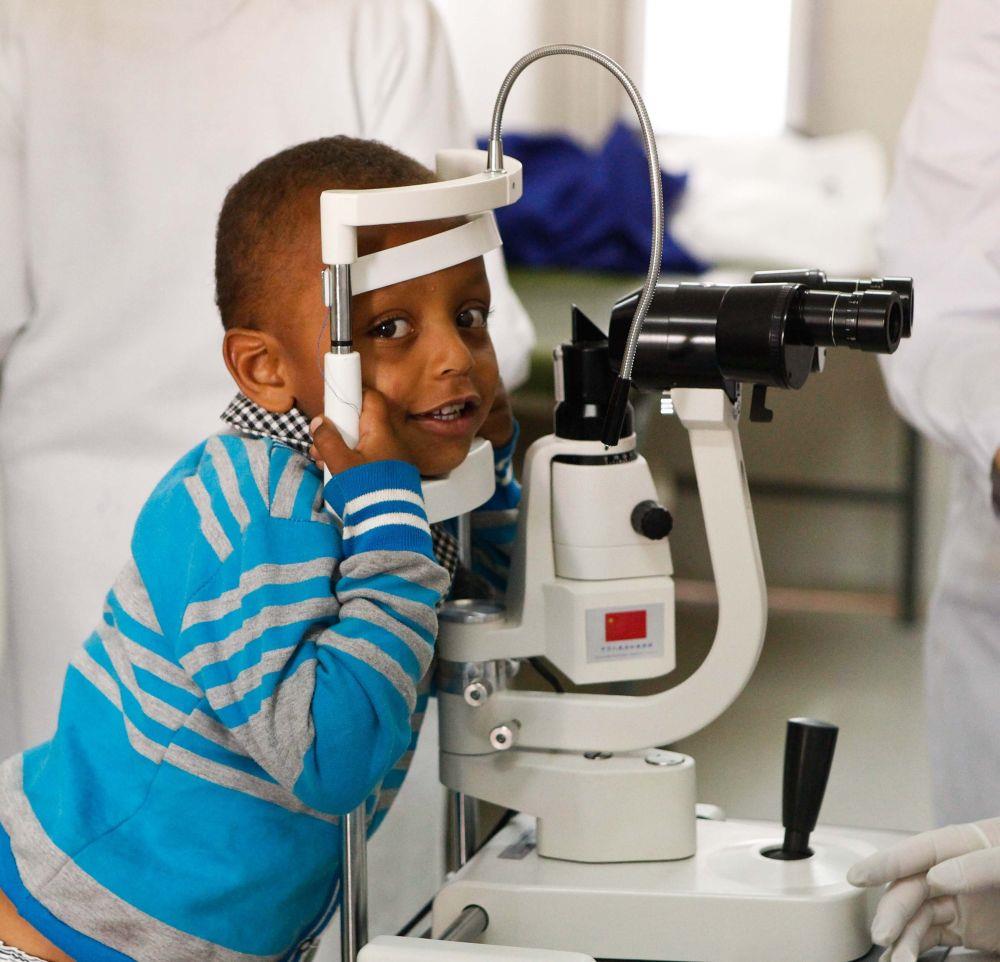 2014年5月2日,在埃塞俄比亚首都亚的斯亚贝巴的阿勒特医院,一名小朋友等待参加“光明行”活动的中国眼科专家为他看诊。