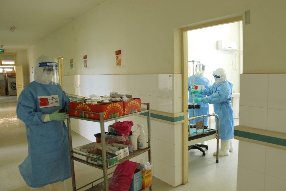 2015年2月18日,在塞拉利昂弗里敦市郊的中塞友好医院埃博拉留观诊疗中心,中国人民解放军302医院援塞医疗队队员们进入埃博拉病房查房,发放药品。
