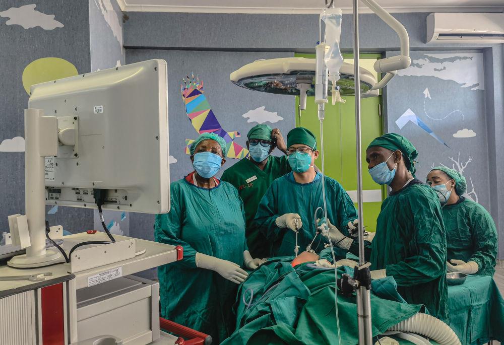2022年10月26日,中国援坦桑尼亚医疗队小儿外科医生丁国建(中)在坦桑尼亚达累斯萨拉姆的穆欣比利国立医院实施小儿腹腔镜手术(手机照片)。半个多世纪以来,中国援外医疗队和各项目组始终奋战在非洲地区病、传染病以及重大公共危机防治第一线。