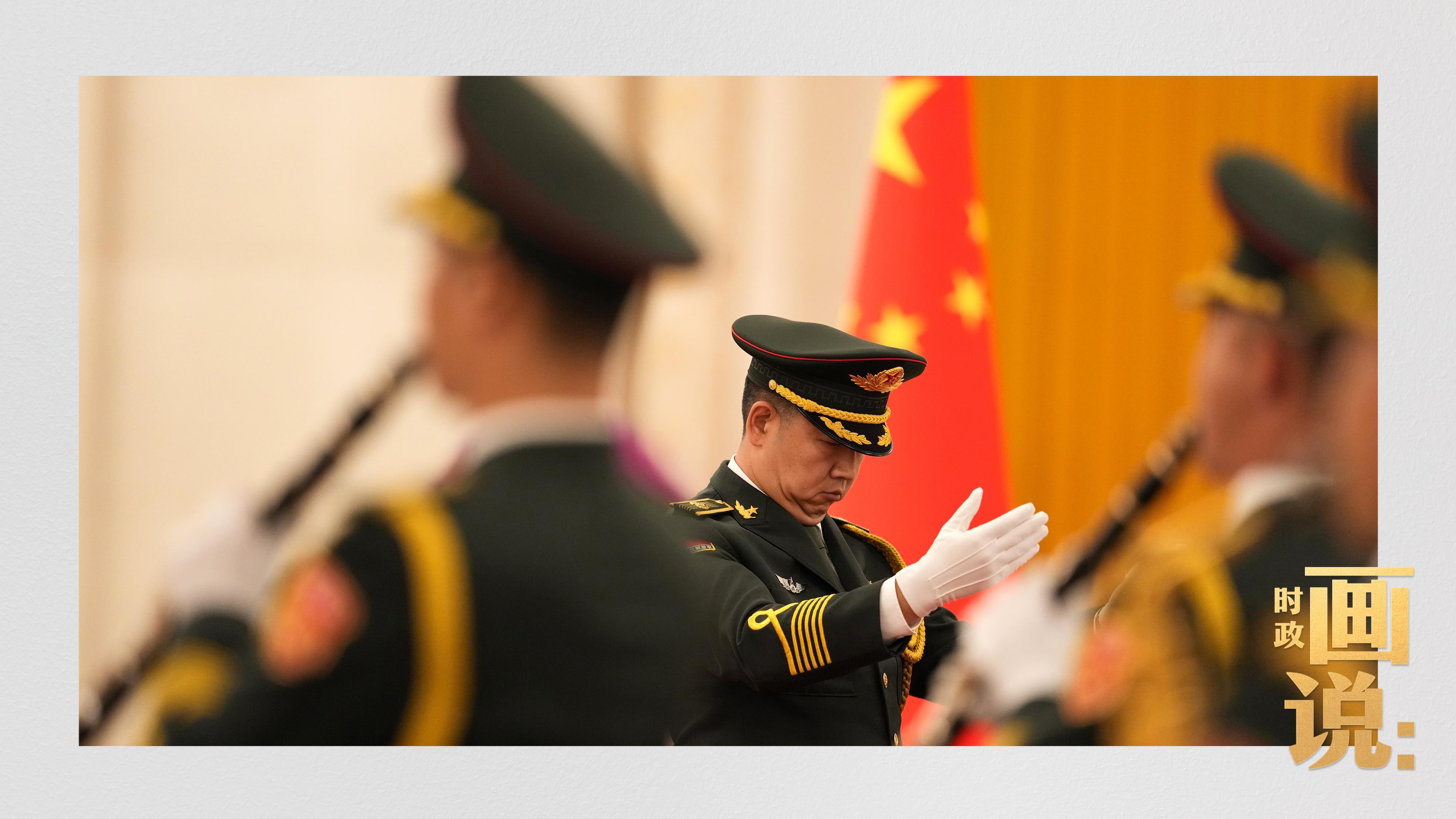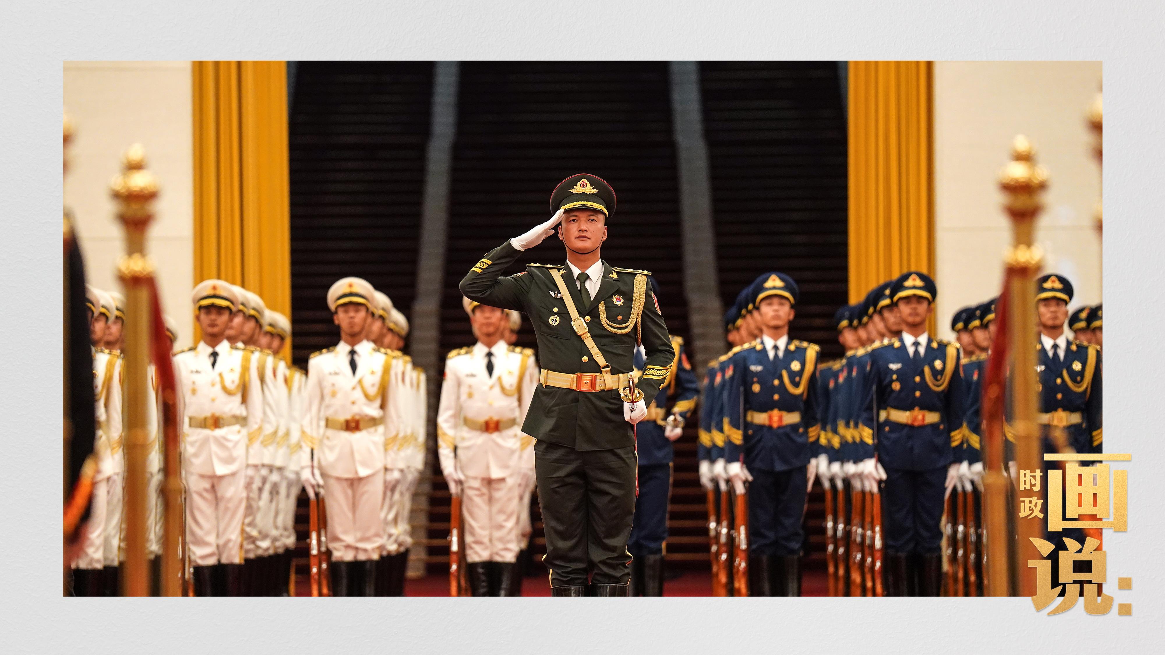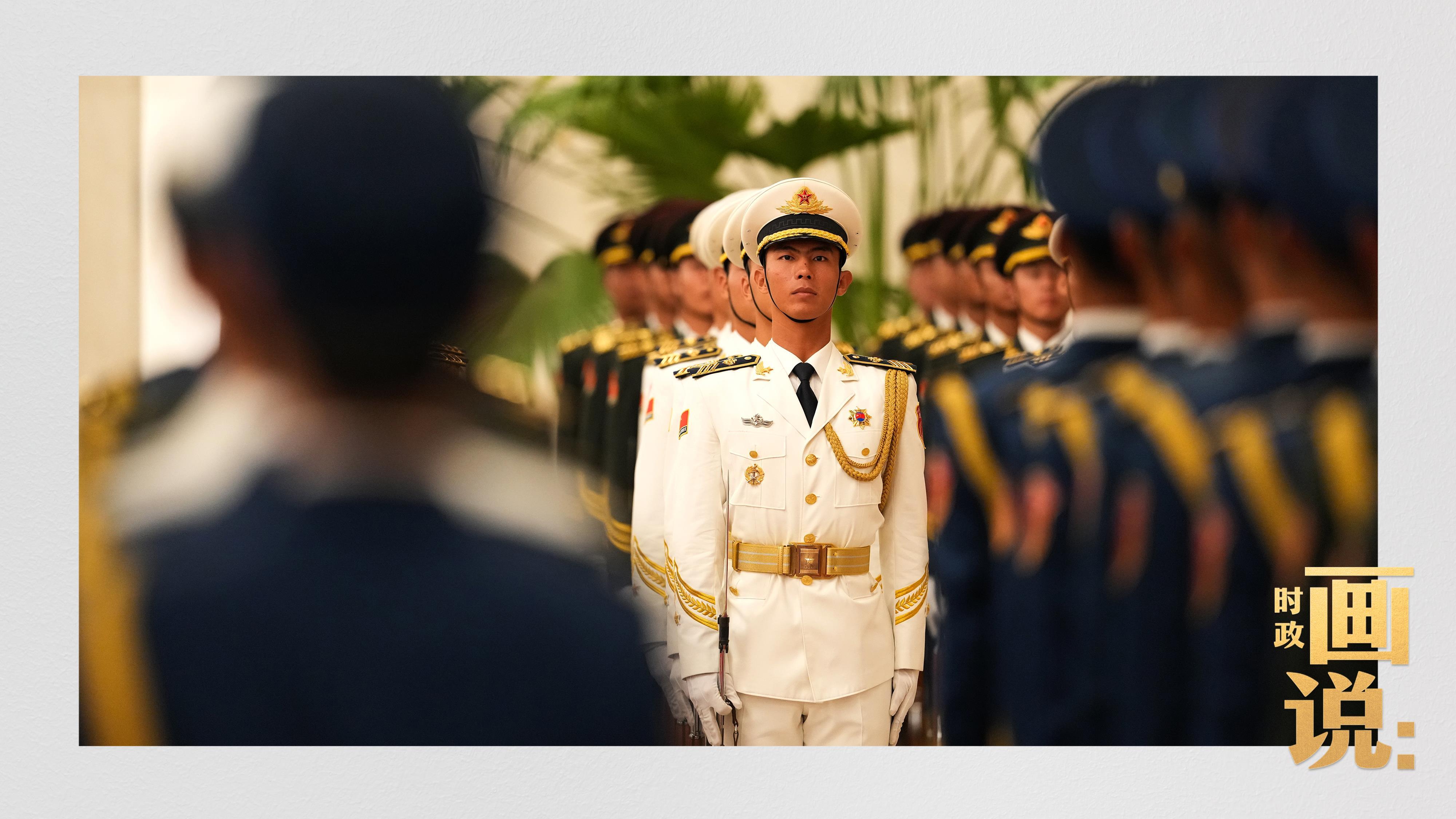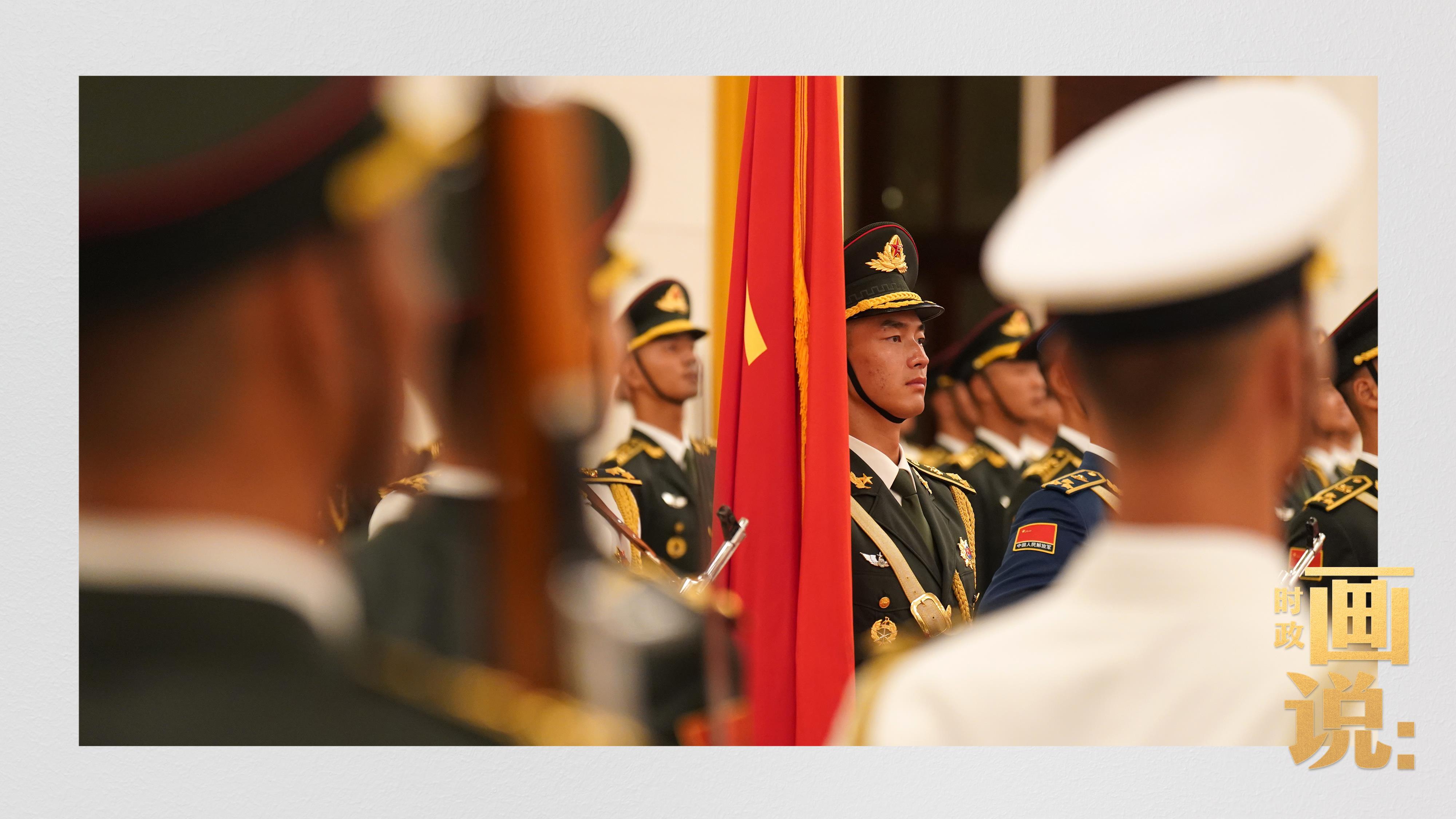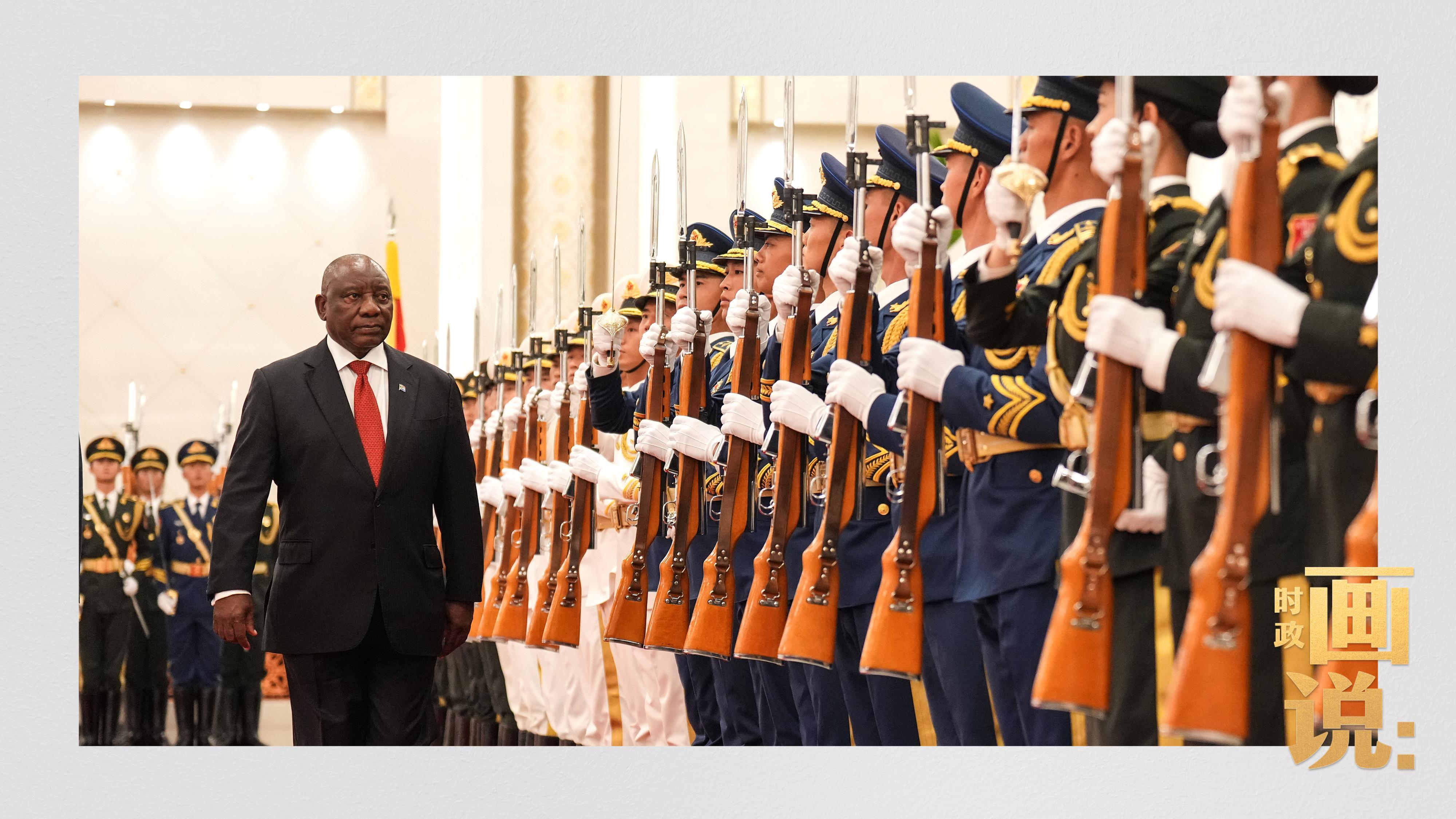 △南非总统拉马福萨检阅中国人民解放军三军仪仗队。