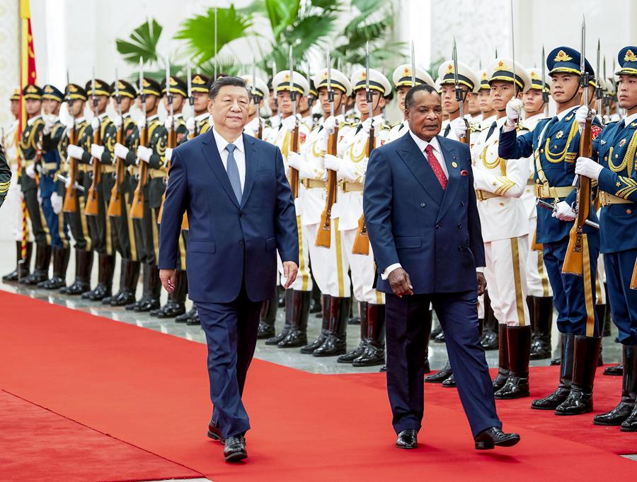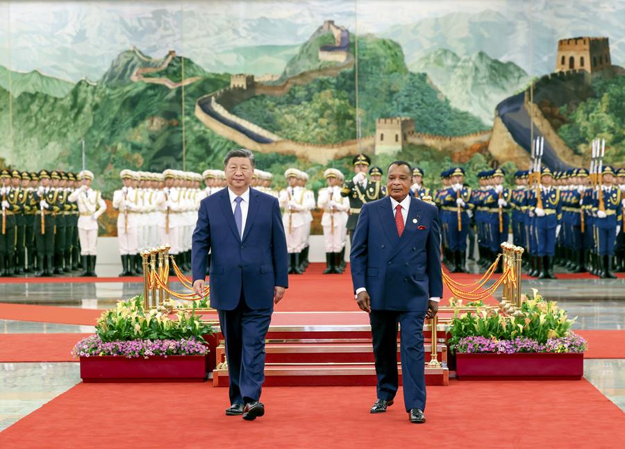 9月6日上午,国家主席习近平在北京人民大会堂同来华出席中非合作论坛北京峰会并进行国事访问的刚果(布)总统萨苏举行会谈。