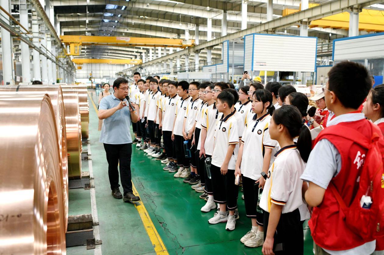 △ 2023年6月9日,在安徽某公司铜板带制造车间,铜陵市第七中学学生在上“行走的思政课”。