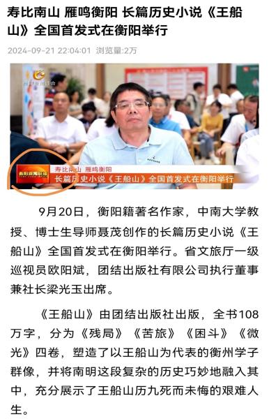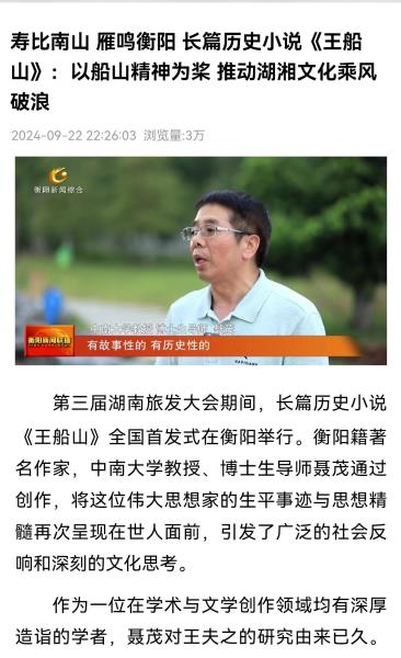 “今年是王船山诞辰405周年,适逢第三届湖南旅发大会在衡阳召开,我的四卷本长篇历史小说《王船山》首发式选择在船山先生出生地王衙坪旁的衡阳市图书馆举行,体现了举办的精心、用心和费心,具有历史和现实的双重意义。”9月24日,中南大学教授、博士生导师、《王船山》一书作者聂茂在接受采访时感慨道:“自首发式以来,从中央到地方的新闻媒体持续关注,不断报道和推介,助力《王船山》‘火出圈’,我心存感激。与其说是这部历时12年100多万的小说写得不错,不如说是我们这个时代仍然需要船山精神的鼓舞和激励。船山先生在那样一个山河破碎、民不聊生的年代做出了一番惊天伟业,我们还有什么理由躺平摆烂、而不去发愤努力成就更好的自我呢?”