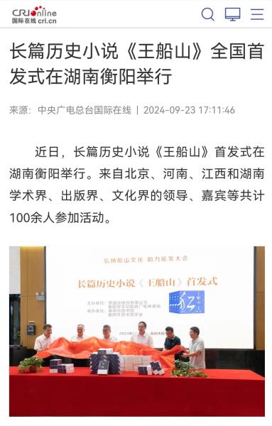 长篇历史小说《王船山》首发以来,全国至少有上百家新闻媒体进行了不同层面的报道,真是好评如潮。而在此前的9月13日,湖南日报就以整版的评论对该书进行重磅推介,可见该书受重视的程度。