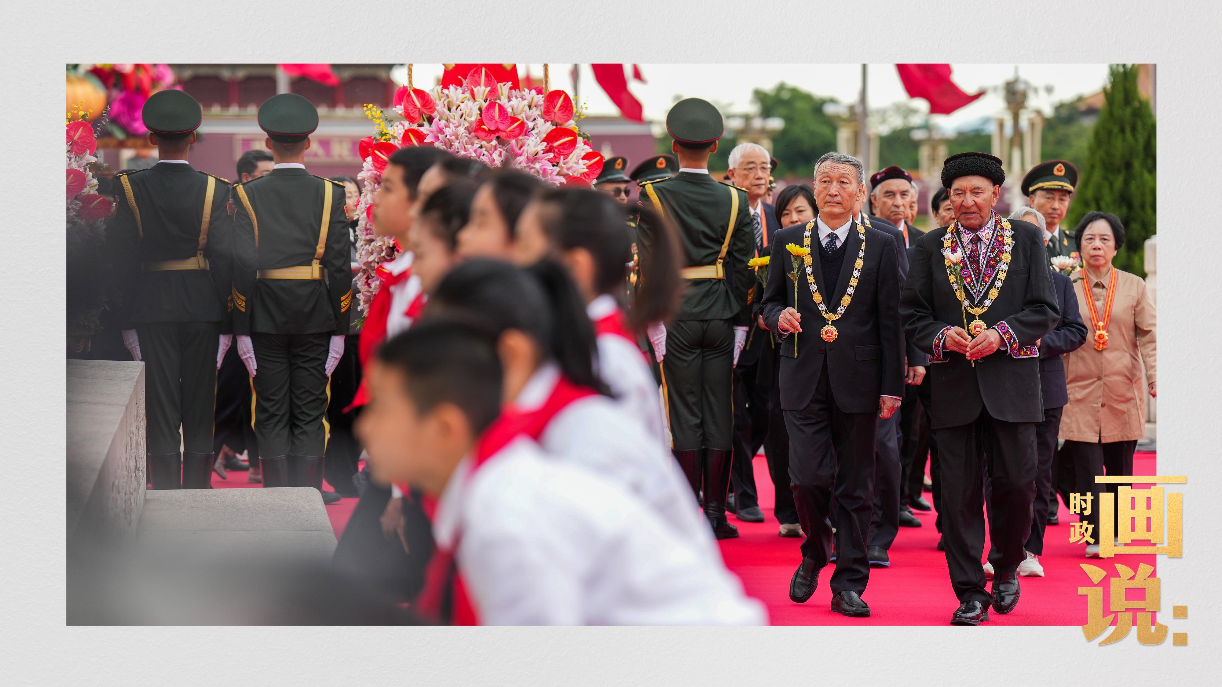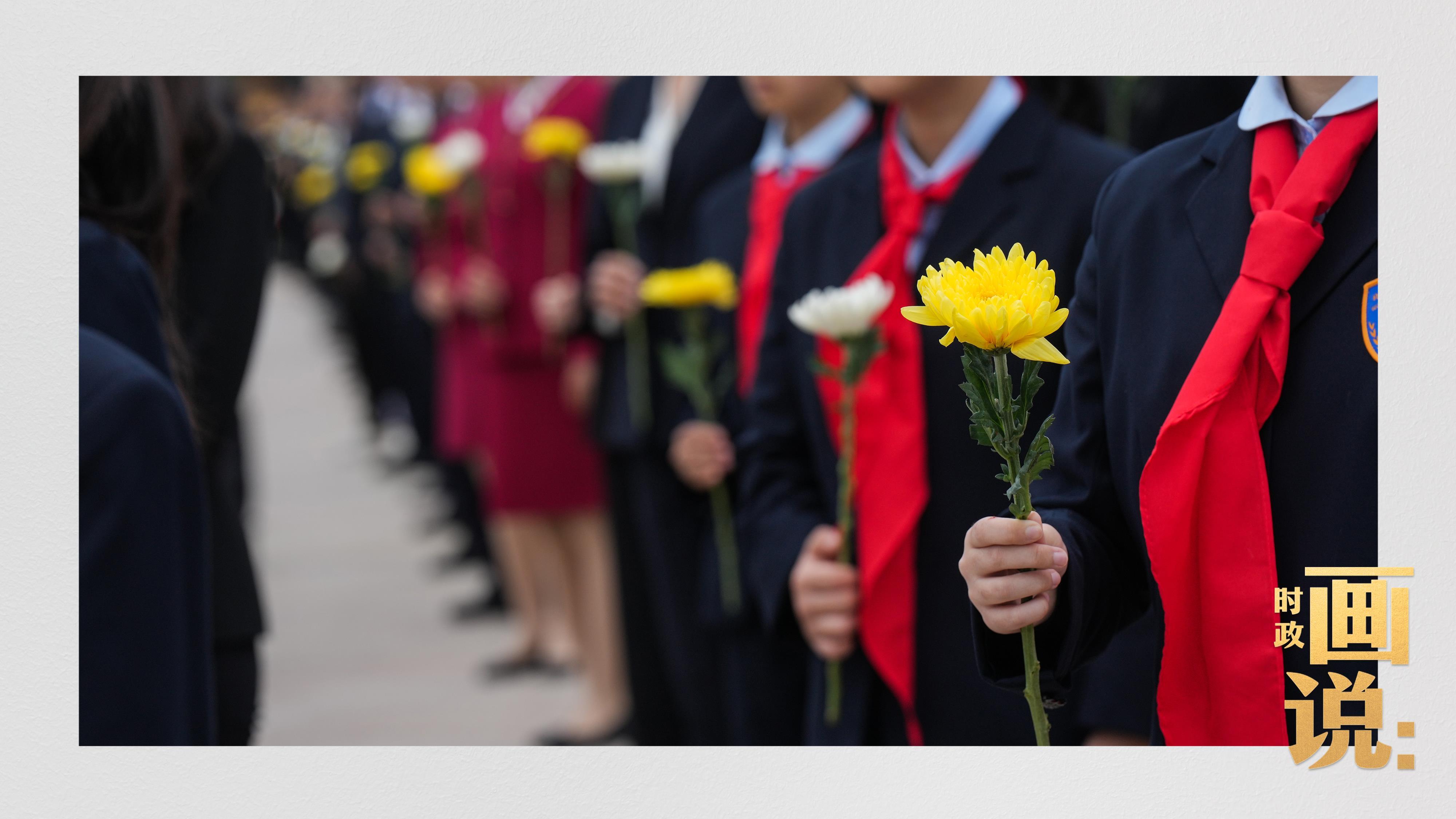 △少年儿童和各界代表依次走到纪念碑前,献上手中鲜花并瞻仰纪念碑。