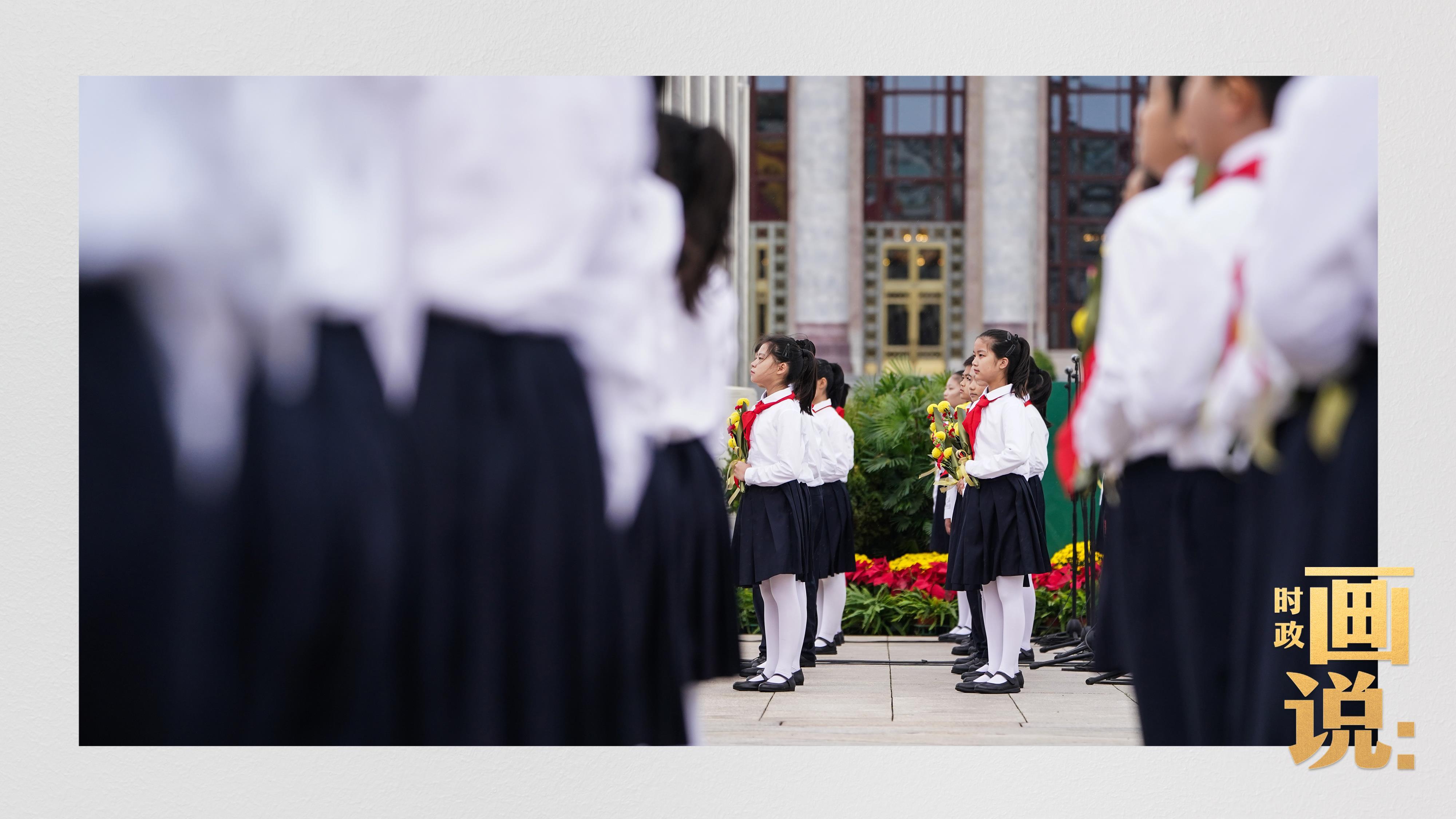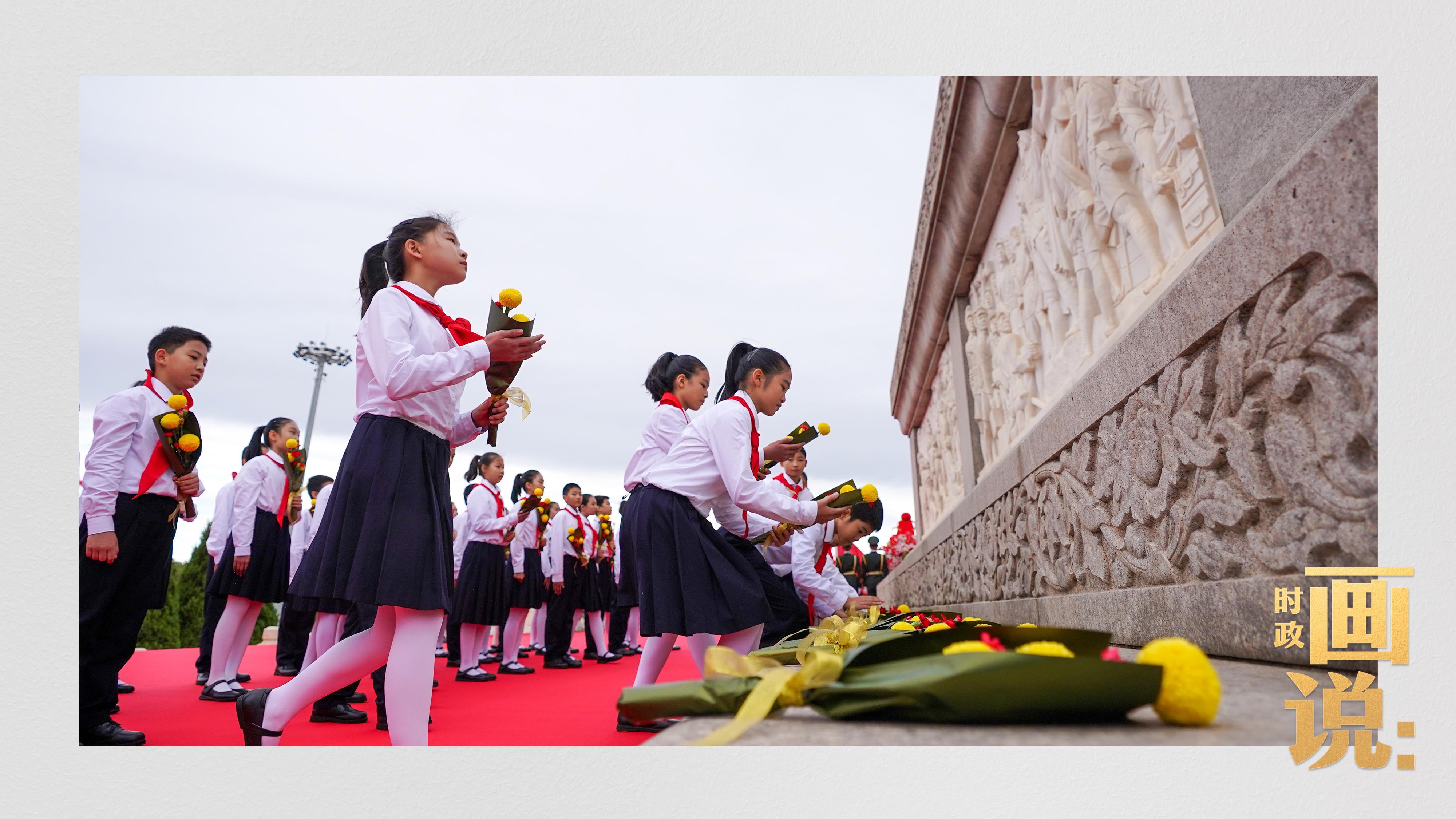 △手持鲜花的少年儿童面向人民英雄纪念碑高唱《我们是共产主义接班人》。