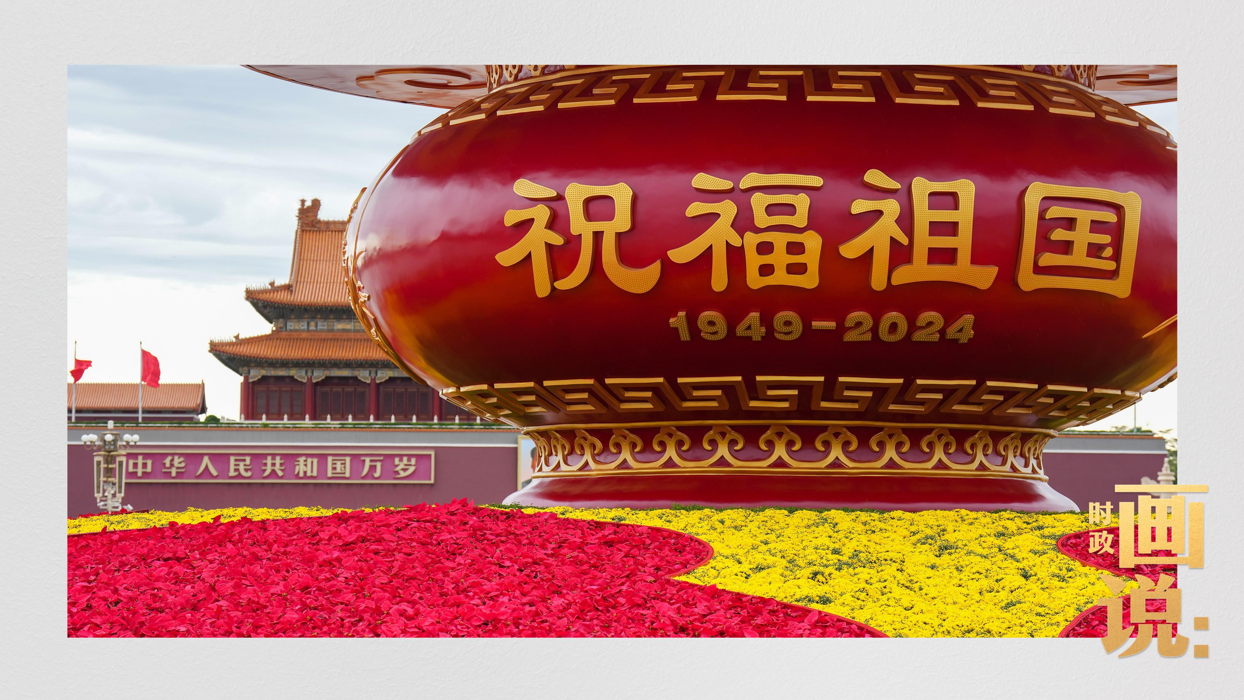 △天安门广场中央,“祝福祖国”巨型花篮表达着对国家繁荣富强的美好祝福。