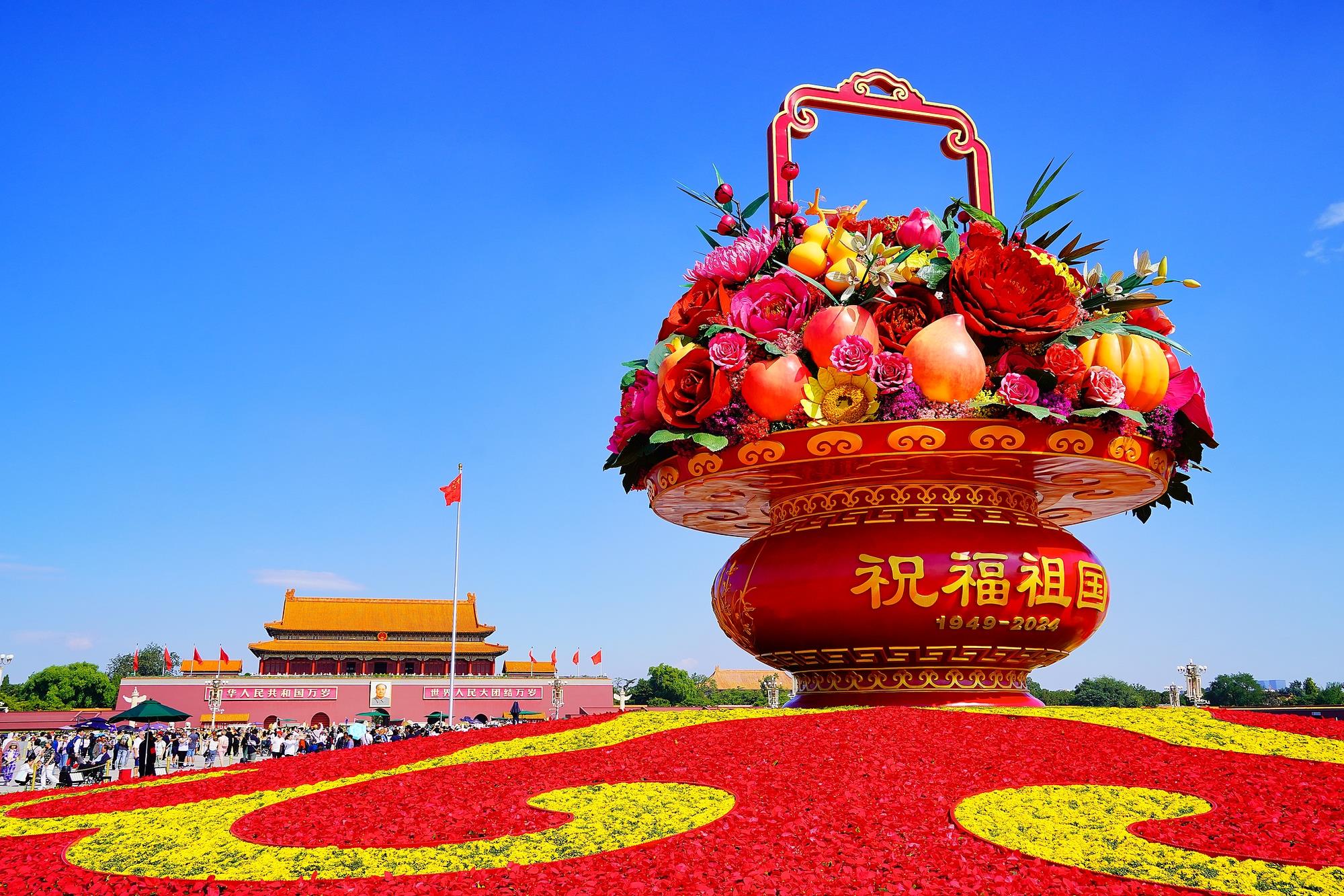 北京:天安门广场上的“祝福祖国”巨型花篮