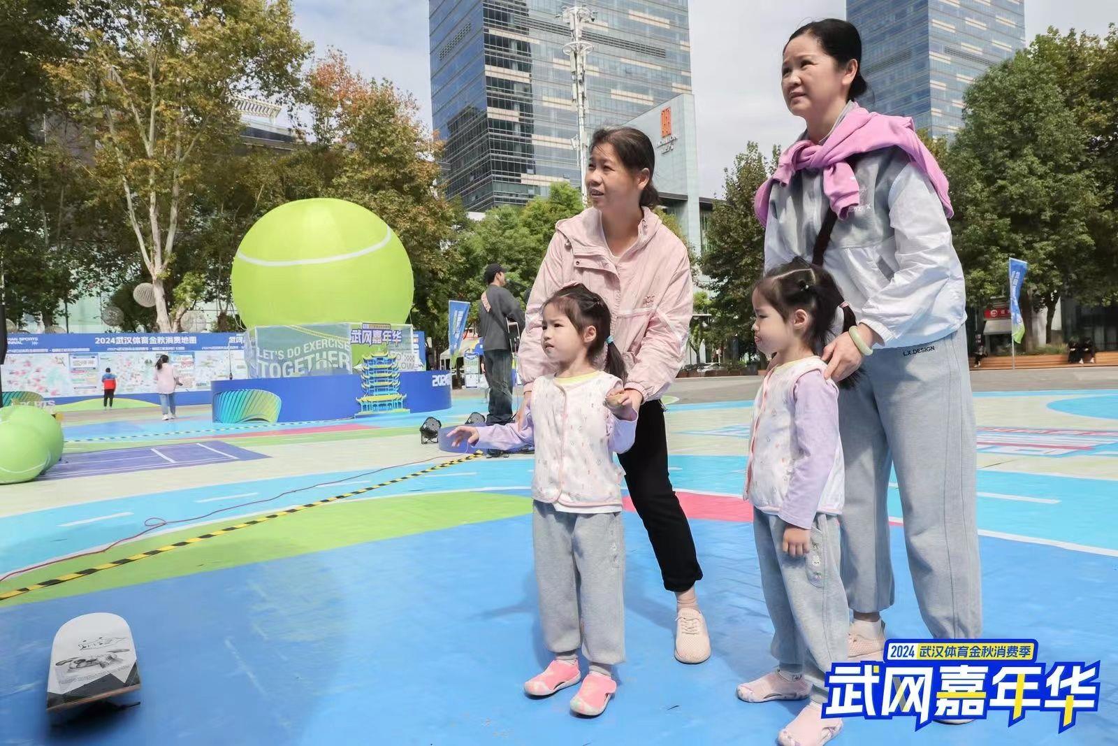 10月4日,武汉天地商圈热闹非凡,武汉体育金秋消费季——武网嘉年华分会场,琳琅满目的市集展销,设置了网球、篮球、冲浪等多样运动互动装置,还有多个特色城市打卡点,吸引了市民游客前来体验。游客樊女士介绍,专程带孩子过来看比赛,平时也会打网球,在这里动一动热热身,很有意思。