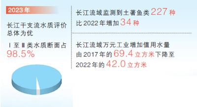 岸绿景美,水生态环境持续复苏。水清河畅,2023年长江干支流水质评价总体为优,Ⅰ至Ⅲ类水质断面占98.5%。长江干流涉嫌违法违规的2441个岸线利用项目均完成整改,共腾退岸线长度162公里。鱼翔浅底,2023年长江流域监测到土著鱼类227种,比2022年增加34种,长江“十年禁渔”行动对恢复水生生物多样性起到明显效果。节水优先,长江流域万元GDP用水量由2017年的70.0立方米下降至2022年的49.1立方米。