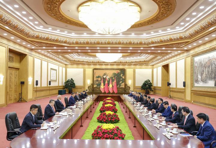 习近平指出,坚持共产党领导和社会主义制度是中越两国最本质的特征,也是发展中越关系最坚实的政治基础。中方将越南视为周边外交的优先方向,愿同越方一道,在深化高水平互利合作上走在前列,在维护国际公平正义上走在前列,在推动人类进步事业上走在前列,携手构建具有战略意义的中越命运共同体。