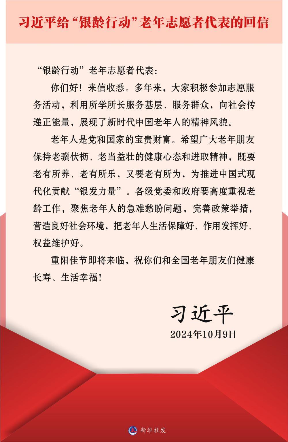 重阳节前,习近平总书记给“银龄行动”老年志愿者代表回信,对他们予以亲切勉励,向全国的老年人致以诚挚问候。