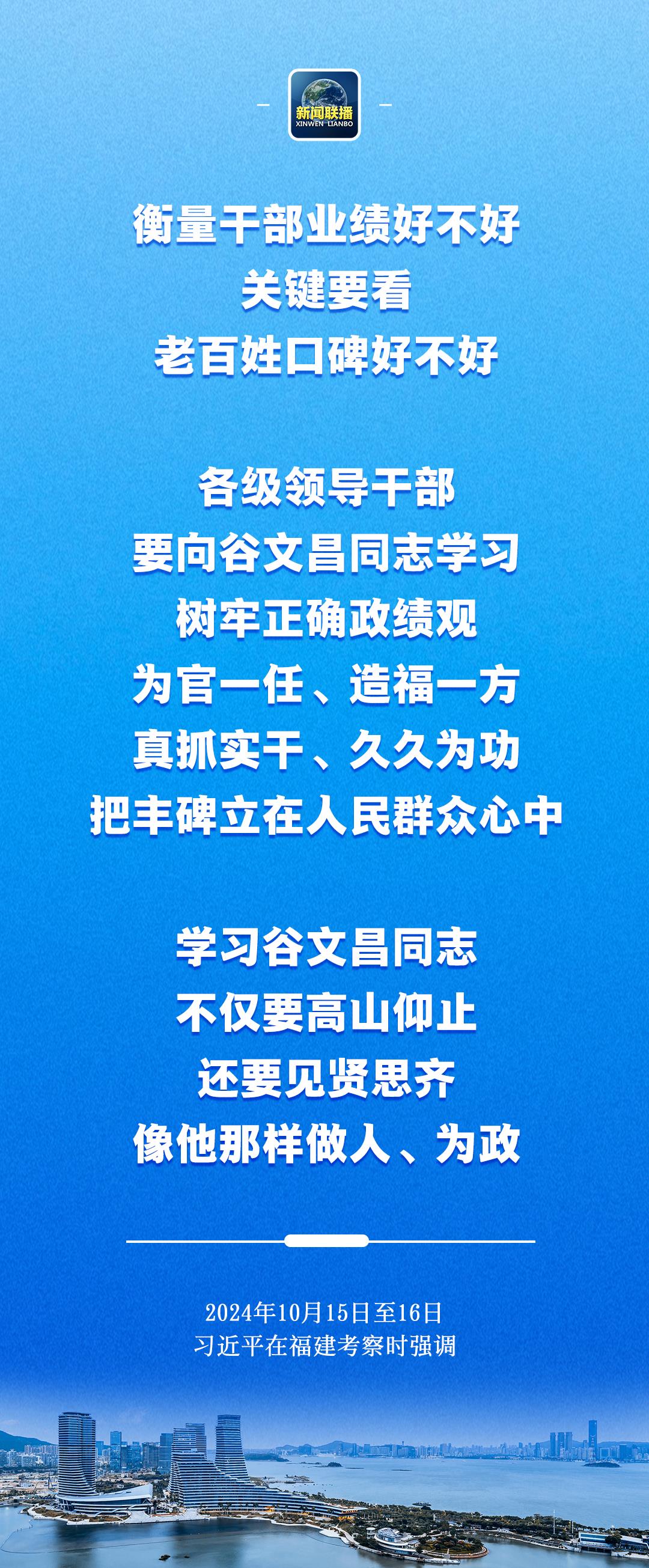 习近平在谷文昌纪念馆考察时指出,衡量干部业绩好不好,关键要看老百姓口碑好不好。各级领导干部要向谷文昌同志学习,树牢正确政绩观,为官一任、造福一方,真抓实干、久久为功,把丰碑立在人民群众心中。学习谷文昌同志,不仅要高山仰止,还要见贤思齐,像他那样做人、为政。