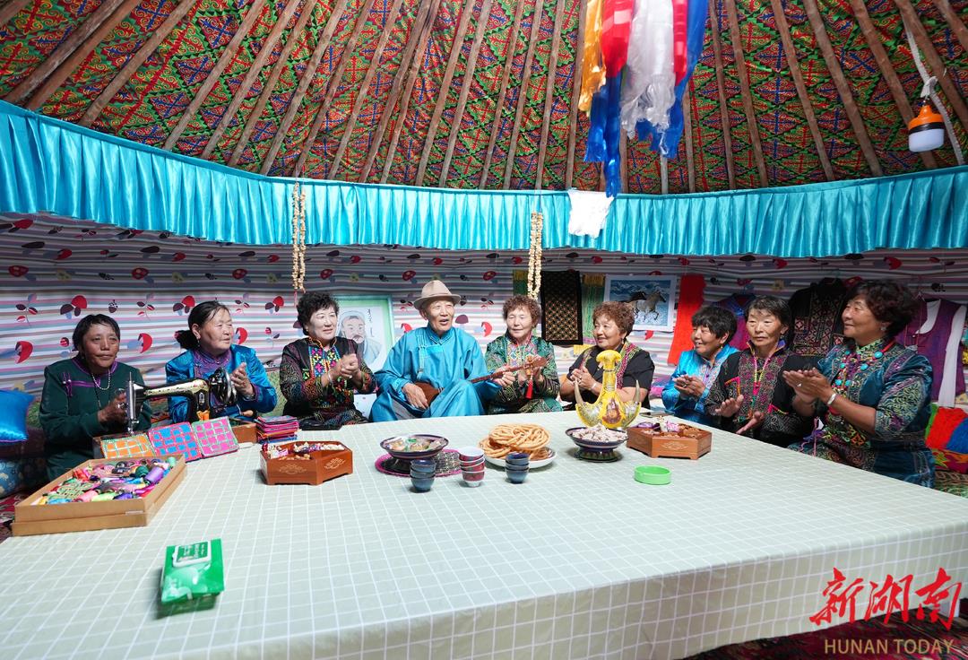 7月18日,新疆维吾尔自治区和布克赛尔蒙古自治县江格尔广场,人们在蒙古包里听江格尔齐(左四)演唱《江格尔》史诗。