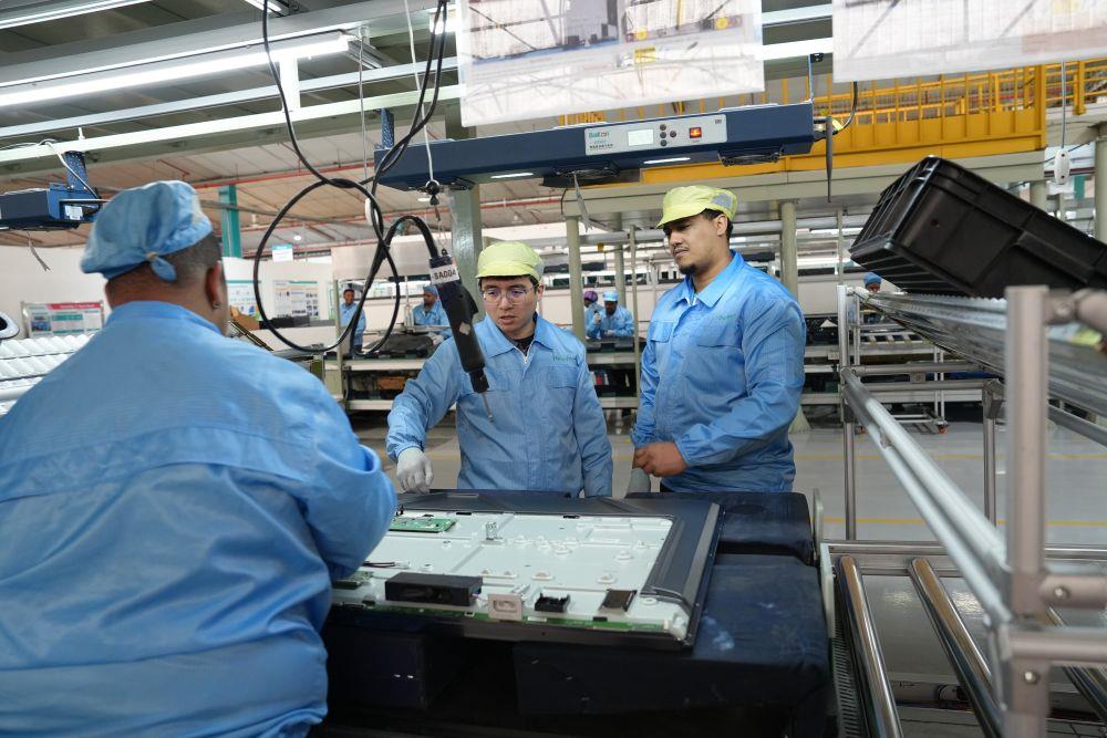 2024年8月14日,中方工程师(中)在南非开普敦的海信南非工业园电视机生产线上指导当地员工工作。工业园已为当地创造1000多个直接就业机会、5000多个间接就业岗位,带动地区产业链发展。