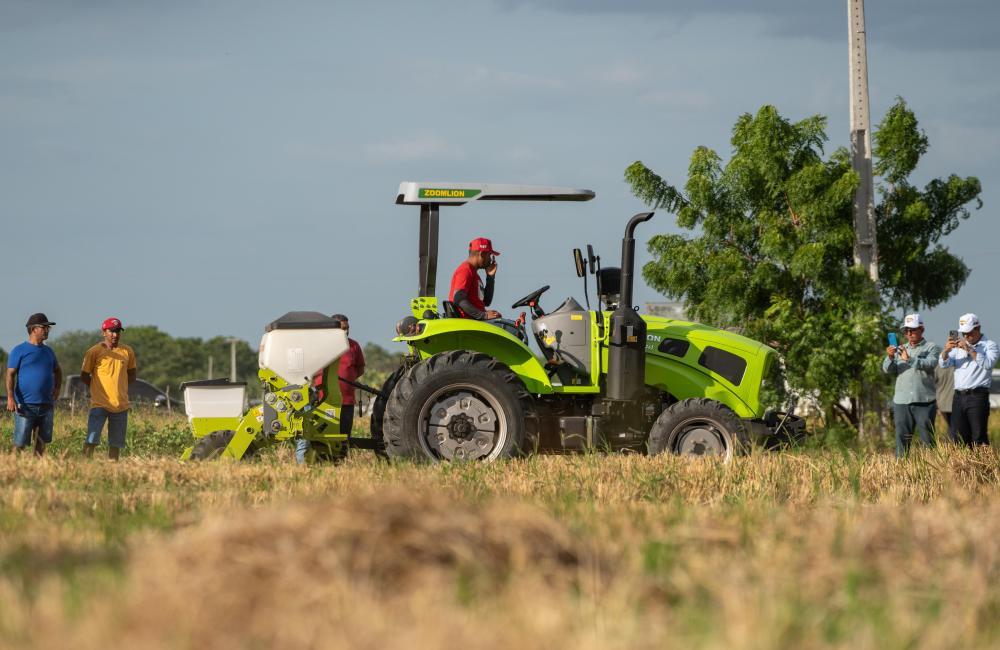 2024年2月2日,在巴西阿波迪的中巴农业机械化合作示范农场,一款中国生产的农机在田间示范作业,吸引了人们观看。中巴农业机械化合作示范农场旨在助力巴西农业生产,促进中小农户减贫和乡村振兴。