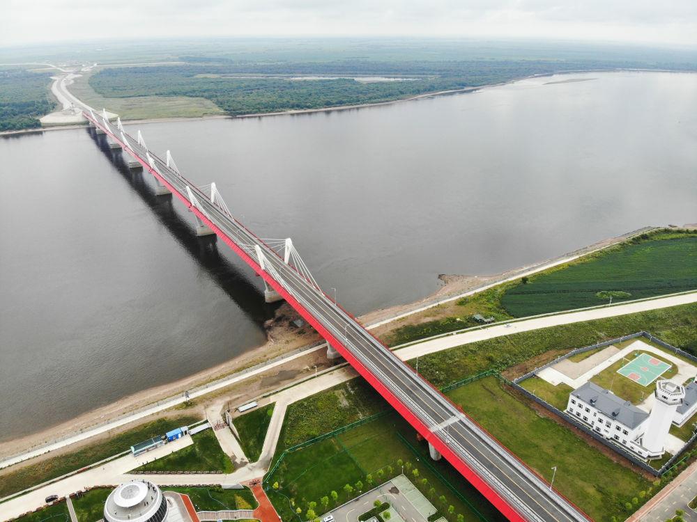 这是在中国黑河一侧拍摄的黑河-布拉戈维申斯克公路桥(2023年8月11日摄,无人机照片)。2022年6月10日,这座中俄首座跨黑龙江公路大桥正式通车,在中国东北地区和俄罗斯远东地区之间开辟了新的国际运输通道。