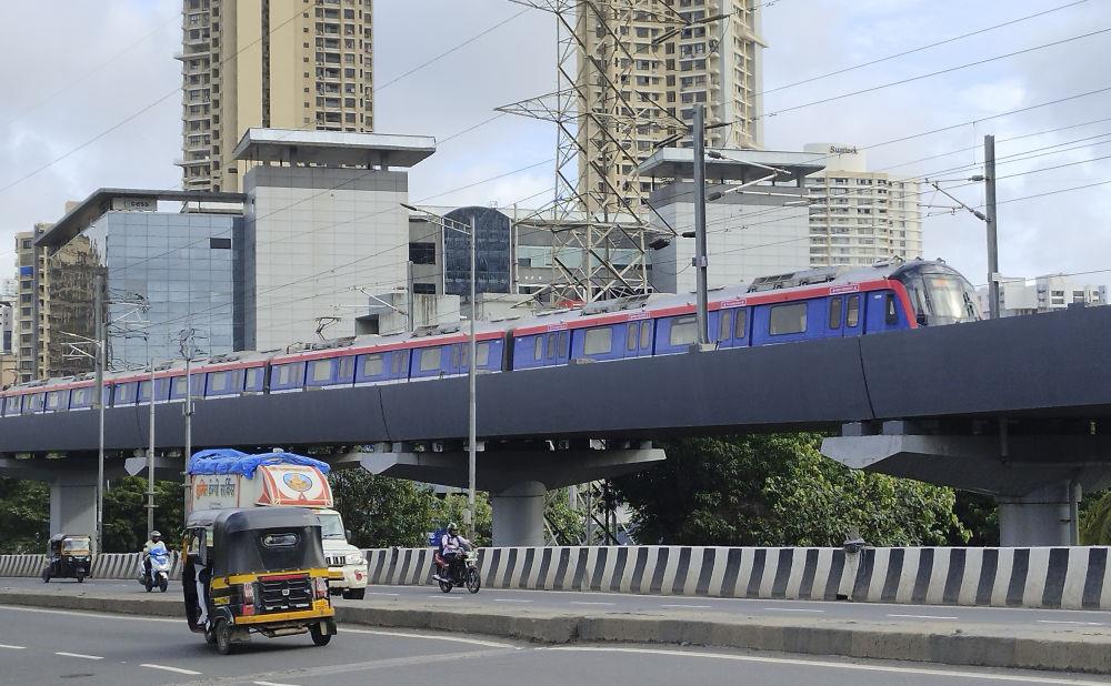 这是在印度孟买北部已开通运行路段拍摄的地铁列车(2022年6月22日摄)。新开发银行向印度孟买北部地铁项目提供了贷款,项目第一部分已于2022年4月开通运营,缓解了沿线地区的城市交通压力。新华社发(阿西夫摄)
