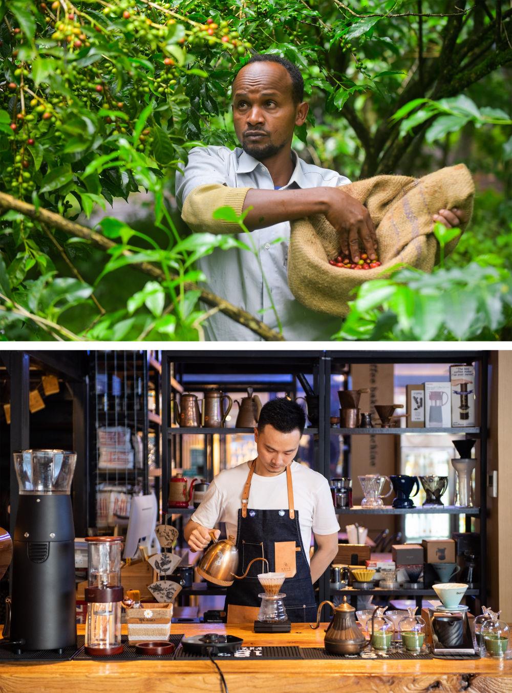 上图:2021年9月22日,在埃塞俄比亚奥罗米亚州戈马地区的一个咖啡园,农民胡森·穆罕默德在采摘咖啡豆;下图:2021年9月24日,在湖南省长沙市高桥大市场非洲咖啡街一家咖啡馆,咖啡师彭杰在制作咖啡饮品。随着中国开放的大门越开越大、中国咖啡消费的快速增长,埃塞俄比亚咖啡在中国越来越受欢迎。