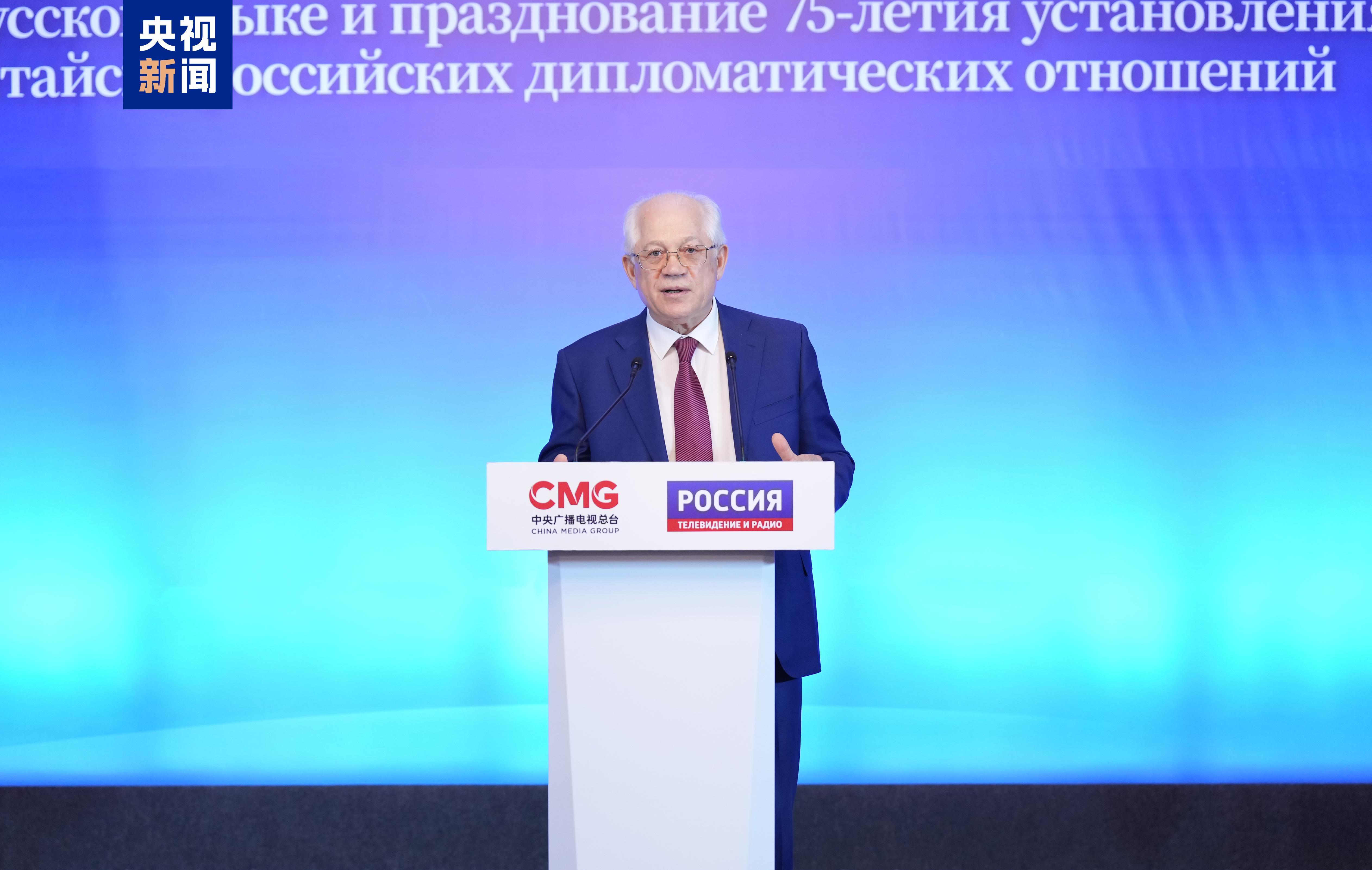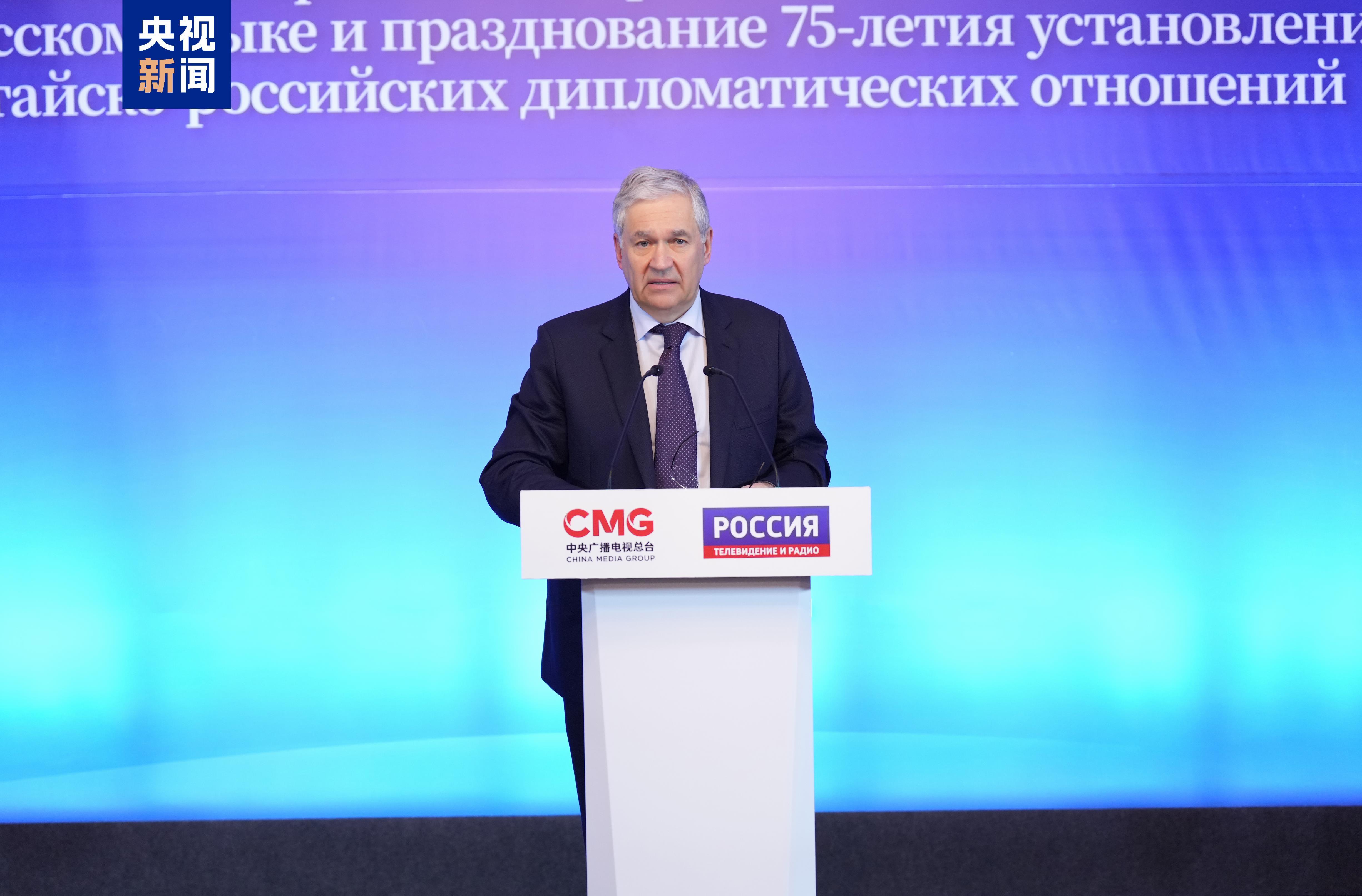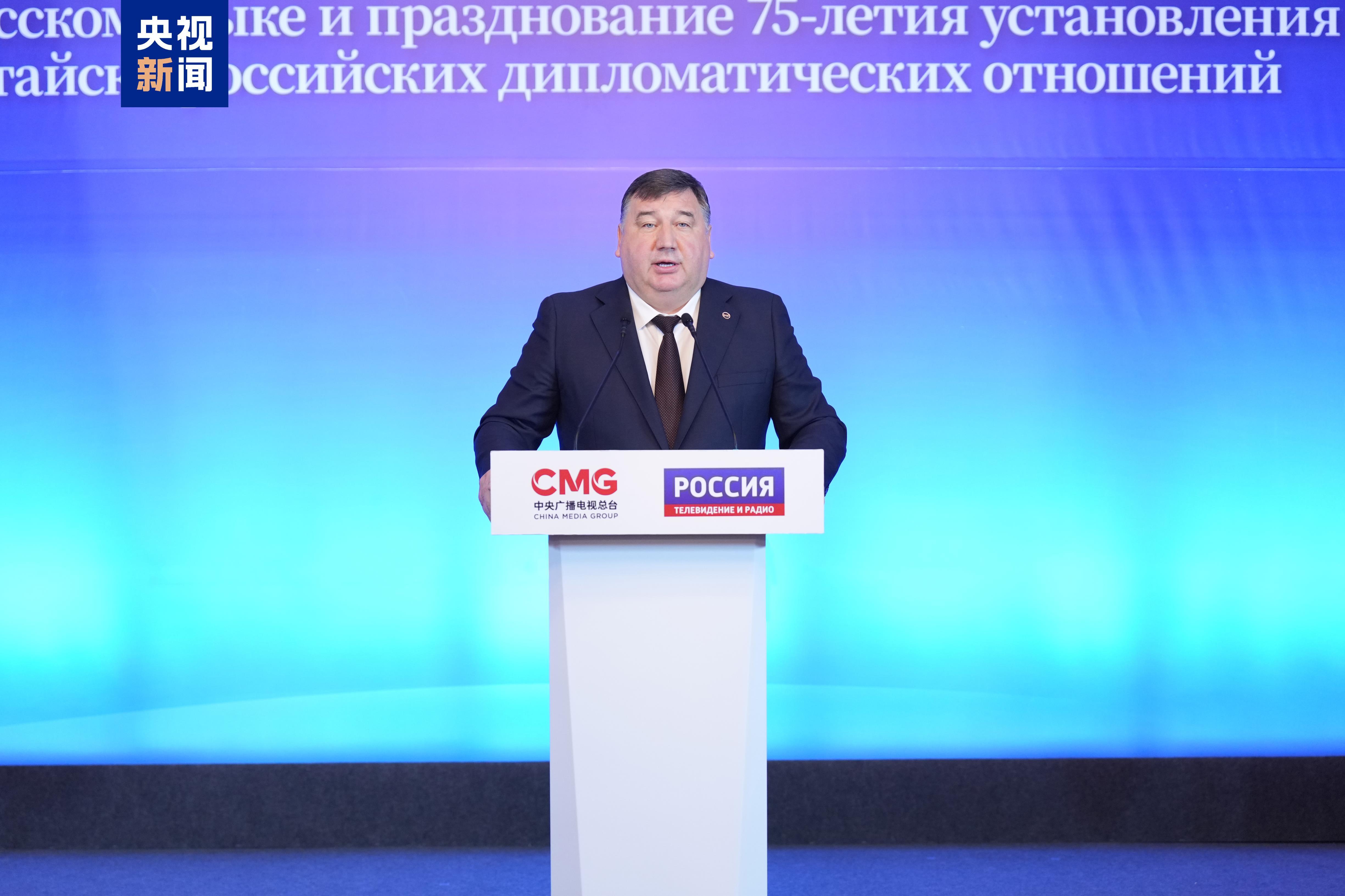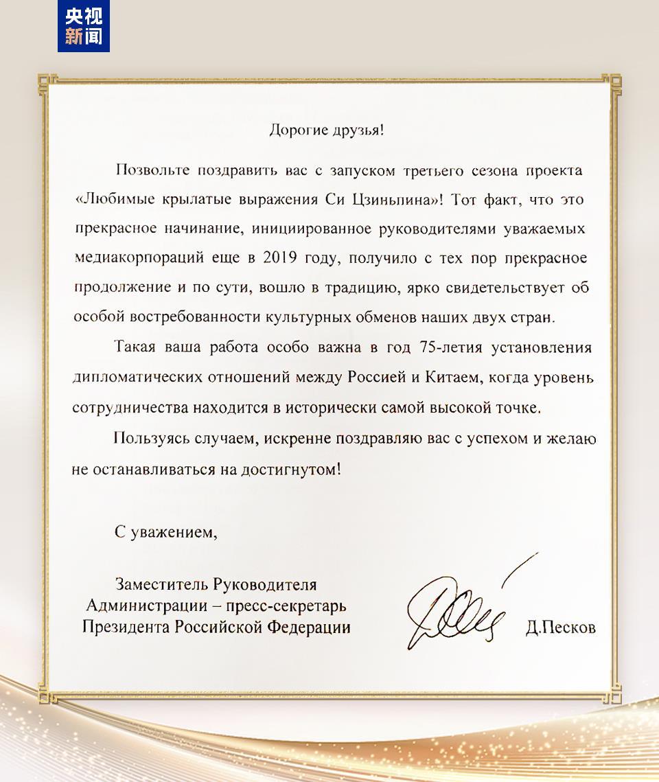 俄罗斯总统办公厅贺信说,2019年起,中国中央广播电视总台制作的《平“语”近人——习近平喜欢的典故》在俄罗斯播出,这个杰出的文化交流项目延续至今,已成为各大俄罗斯媒体的播出传统。今年是俄中建交75周年,目前两国关系处于历史最好时期,今天的活动对促进俄中友好具有十分重要的意义。
