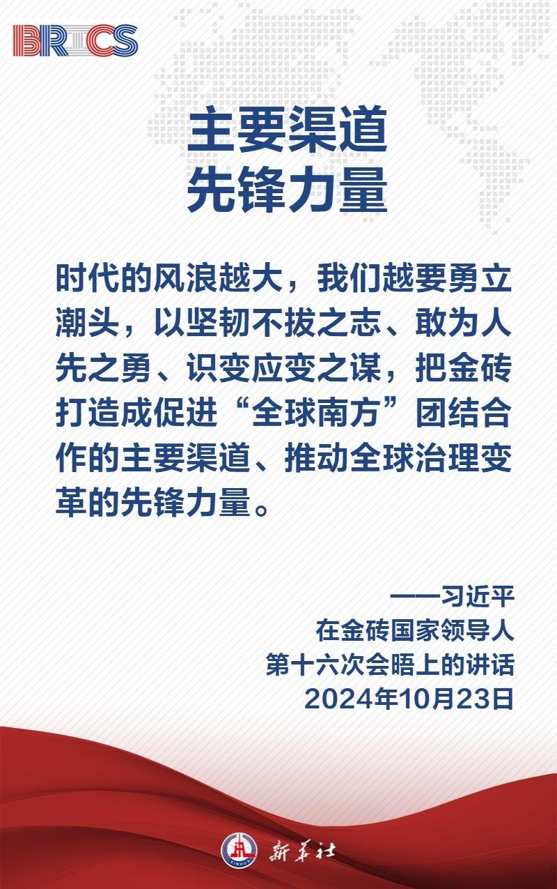 当地时间10月23日,国家主席习近平在俄罗斯喀山出席金砖国家领导人第十六次会晤并发表题为《登高望远,穿云破雾 推动“大金砖合作”高质量发展》的重要讲话,为推动“大金砖合作”行稳致远指明五个方向——