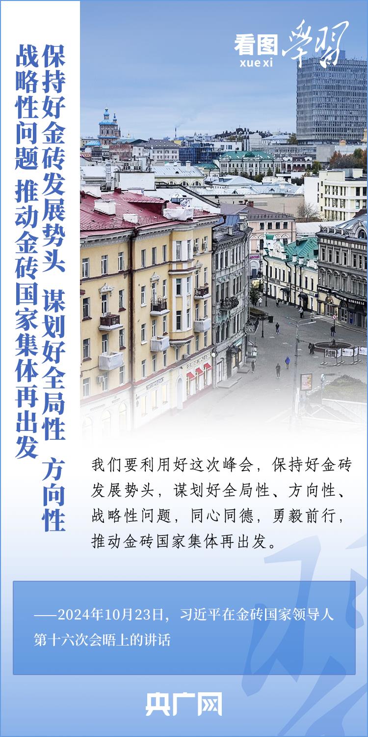 当地时间10月23日,国家主席习近平在俄罗斯喀山出席金砖国家领导人第十六次会晤并发表重要讲话。习主席深刻阐述推动“大金砖合作”高质量发展的中国主张,就金砖大家庭发展合作提出五点务实举措,表达了中方愿同金砖各国一道,携手更多“全球南方”国家共同推动构建人类命运共同体的真诚愿望。一起来学习!