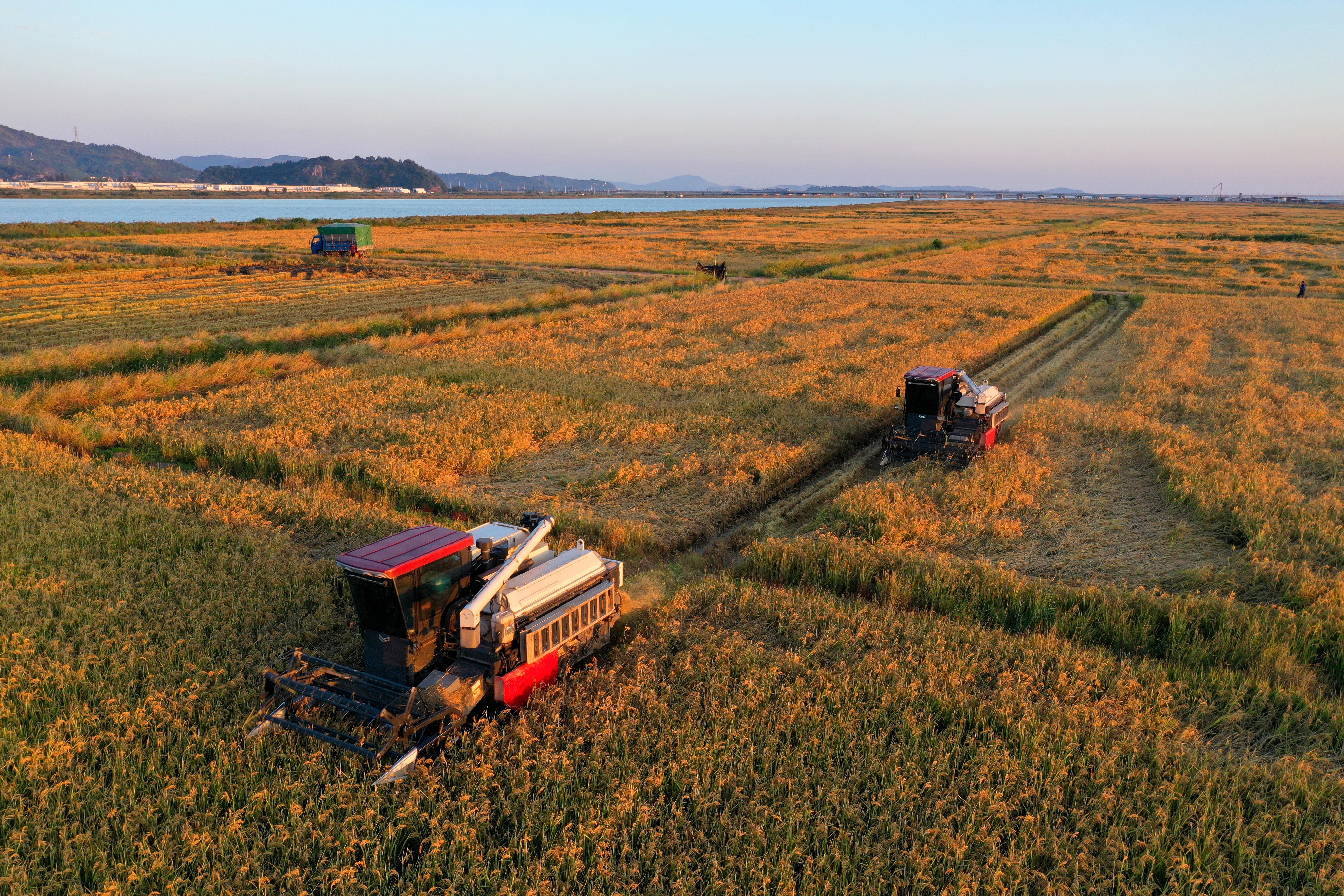 △深秋时节,浙江省玉环市漩门三期智慧农业示范基地的海水稻迎来丰收,农民驾驶收割机忙着收割。