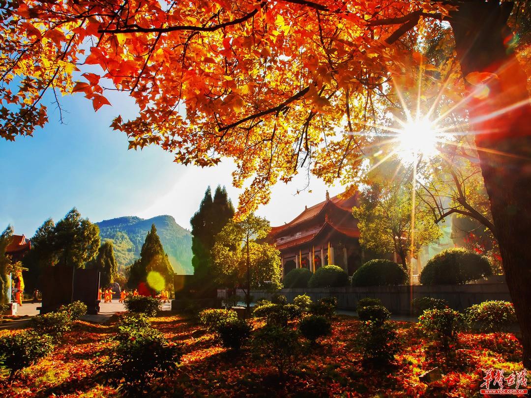 虽已立冬,但九嶷山舜帝陵秋意正浓。火红的枫叶与红墙黛瓦、参天古树交相辉映,满目色彩斑斓。舜帝陵是我国有史以来帝陵中最古老的陵,也是宁远县旅游景区最佳的赏红叶地之一,每年红叶最佳观赏期为11月初至12月中旬。游览完舜帝陵,游客还可以前往三分石景点,感受大自然的鬼斧神工。