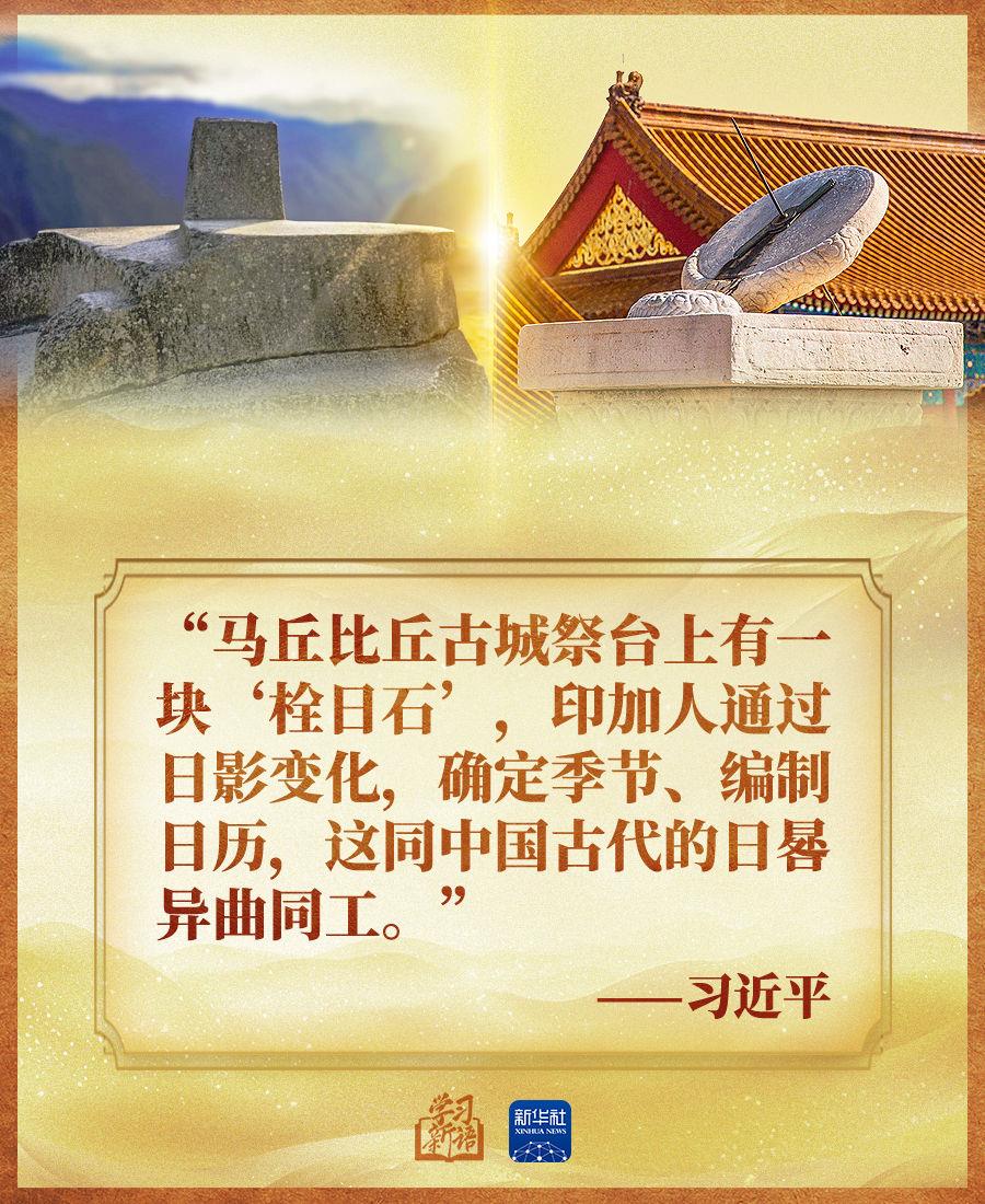 习近平在文章中指出,中华文明是世界上唯一没有中断、延绵5000多年的文明,以卡拉尔文明为代表的海洋文明和以印加文明为代表的陆地文明彰显了秘鲁文明的历史悠久和丰富多元。