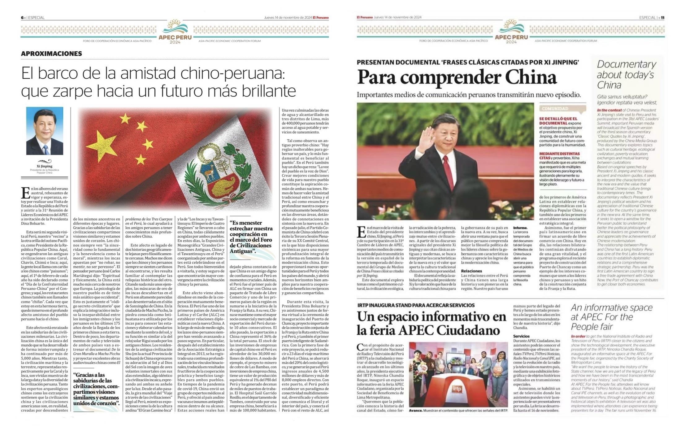 11月14日,秘鲁最具影响力的官方报纸《秘鲁人报》刊发节目在秘鲁落播的消息。文章指出,《平“语”近人——习近平喜欢的典故》第三季展现了中华民族开放包容、兼收并蓄的文化胸怀,阐释了习近平主席提出的推动构建人类命运共同体的这一重大理念,是对“建设一个什么样的世界、怎样建设这个世界”给出的中国方案。《秘鲁人报》特刊整版刊发《平“语”近人——习近平喜欢的典故》第三季(西班牙语版)将在秘鲁主流媒体落播特稿。《秘鲁人报》官网也同步刊发了节目预告消息和海报。