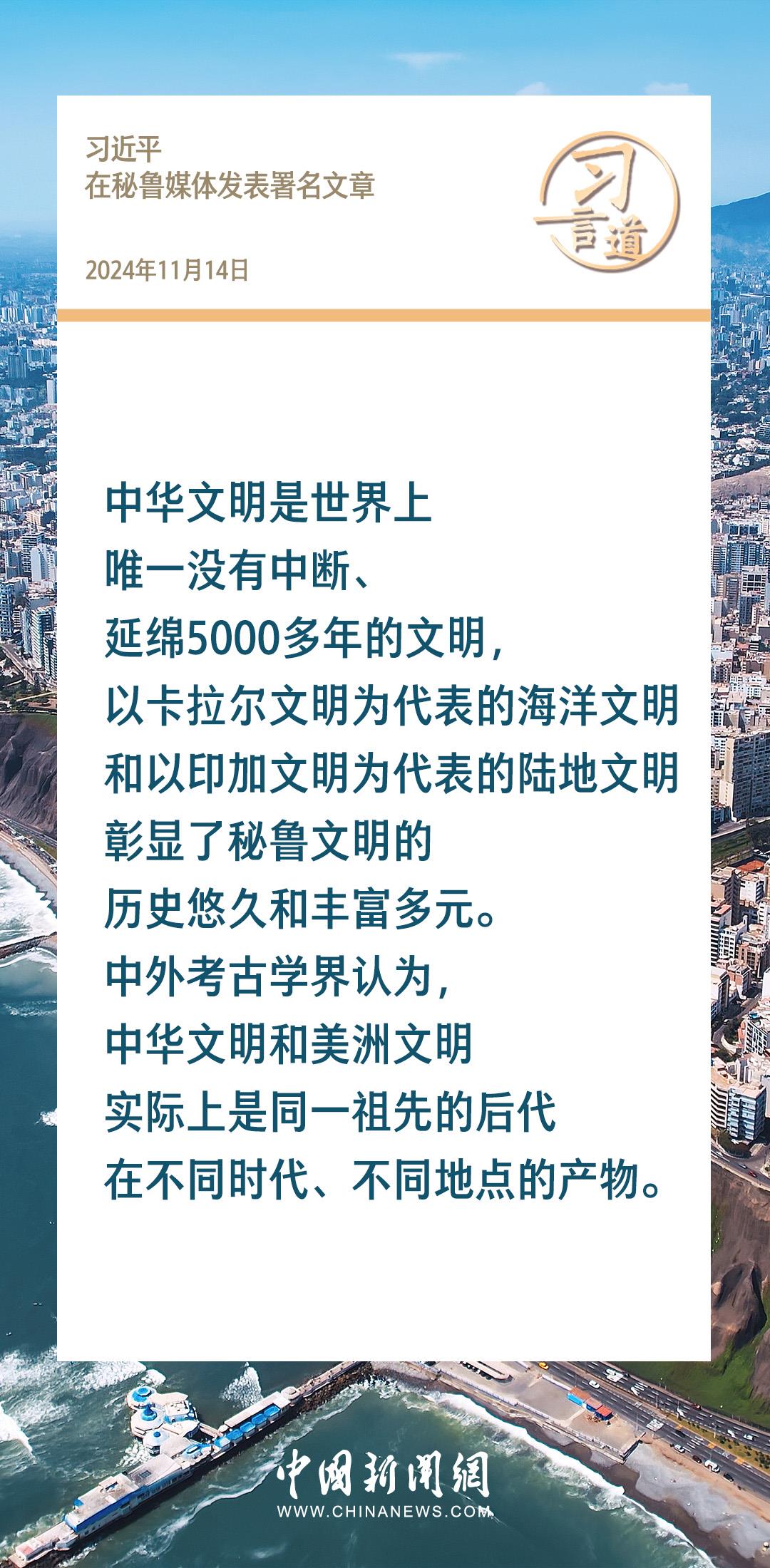 当地时间11月14日,在赴利马对秘鲁进行国事访问并出席亚太经合组织第三十一次领导人非正式会议之际,国家主席习近平在《秘鲁人报》发表题为《让中秘友好之船扬帆远航》的署名文章。