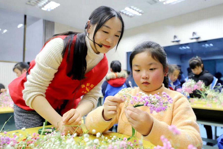 衡阳技师学院支教老师为金月完小的父母外出务工留村儿童们送去插花课程(资料图)。新华网发(衡阳技师学院 周文晋 摄)